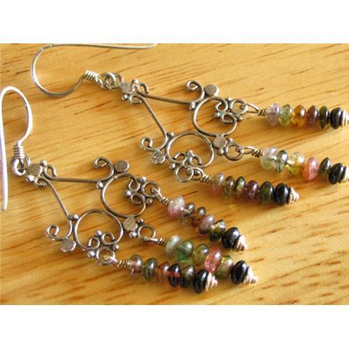 A beautiful mix of button tourmaline gemstones on cute little cap end head pins. hand wrapped on Bali sterling silver chandeliers. Antique look.<p>The beauties hang on nice long Bali sterling ear wires. These hand crafted delights will bring many compliments your way.The earrings measure about 2 inches.<p>Tourmaline comes in a wide range of colors. It enhances flexibility, happiness, objectivity, compassion, serenity, balance, positive transformation, healing, strength, tolerance, and understanding.