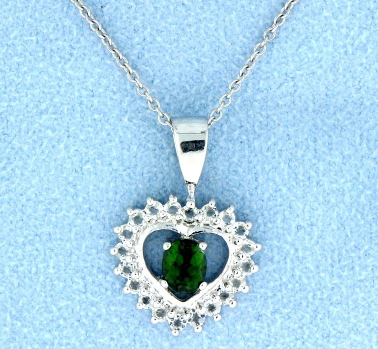 Gorgeous 14k white gold pendant that sparkles with 20 white topaz gemstones and a lovely oval cut Natural Green Tourmaline oval shaped center that measures 5mm x 4mm. The 18" chain is also 14k white gold. 4.2g