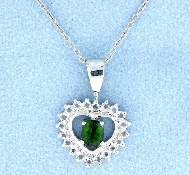 Gorgeous 14k white gold pendant that sparkles with20 white topaz and a lovely oval cut Green Tourmaline center that measures 5.12mm x 4mm. The 18" chain is also 14k white gold. 4.2g