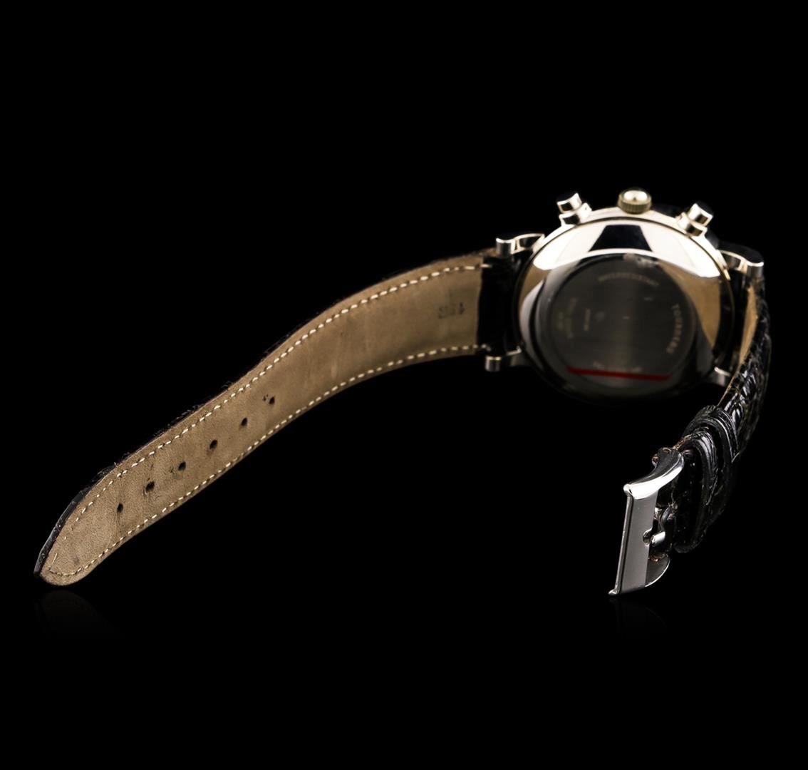 One Tourneau Day-Date Moonphase Chronograph Watch featuring: Movement: Automatic. Case: 18KT White Gold. Case Size: 38mm diameter. Crystal: Sapphire. Dial: Black with roman dial markers. Features: Chronograph, date, day, day/night, month, moon phase, and second hand. Strap/Bracelet: Genuine crocodile leather handmade in Italy. Water Resistance: 30 meters. Minor surface scratches on the back of the case.