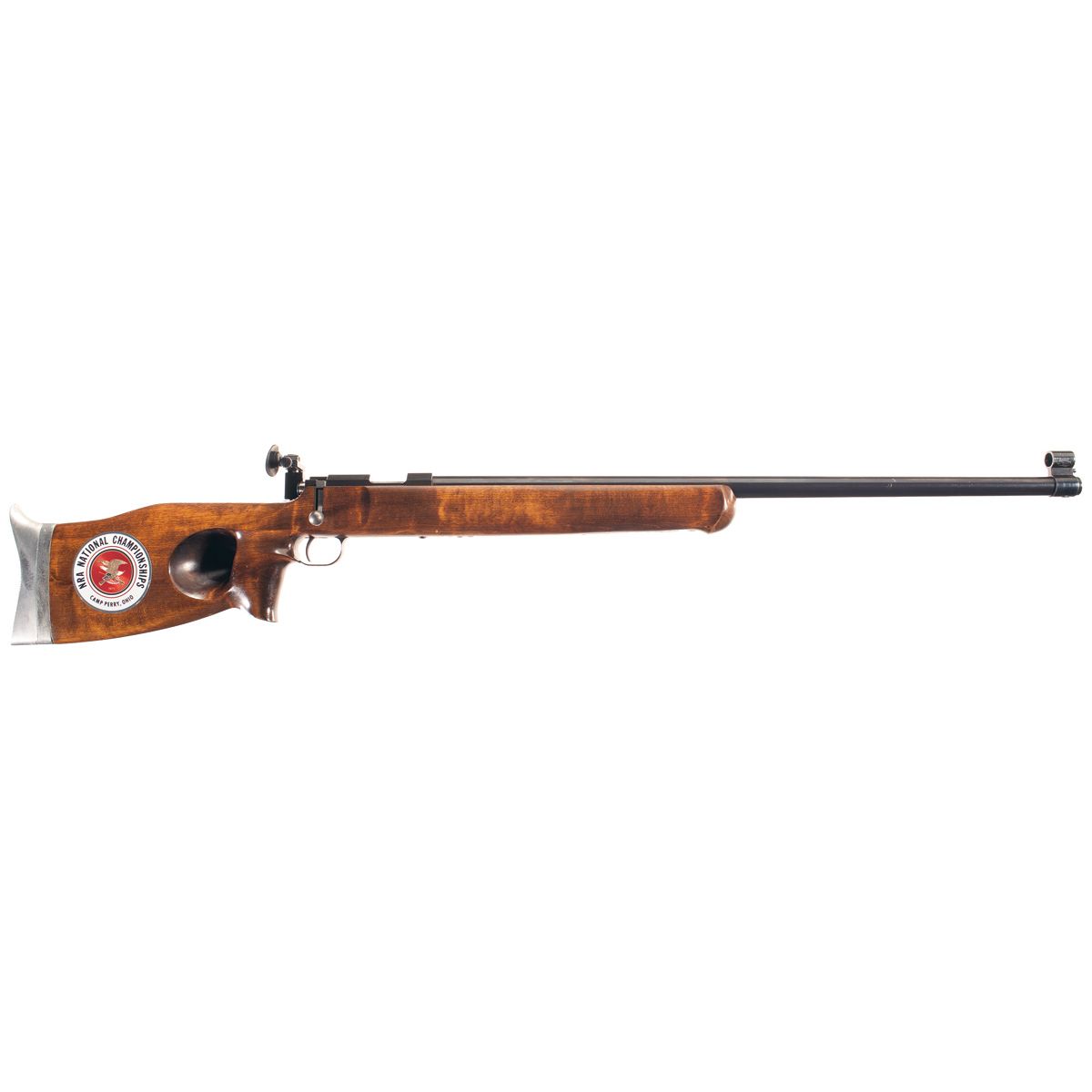 Standard markings with globe front sight on a heavy barrel and adjustable peep sight with rubber eyepiece and adjustable trigger and forearm sling swivel. One piece pistol stock with thumb hole, raised cheekpiece and serrated target buttplate.
