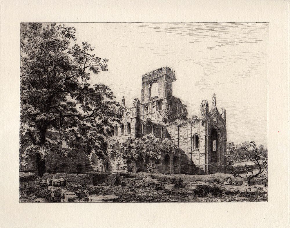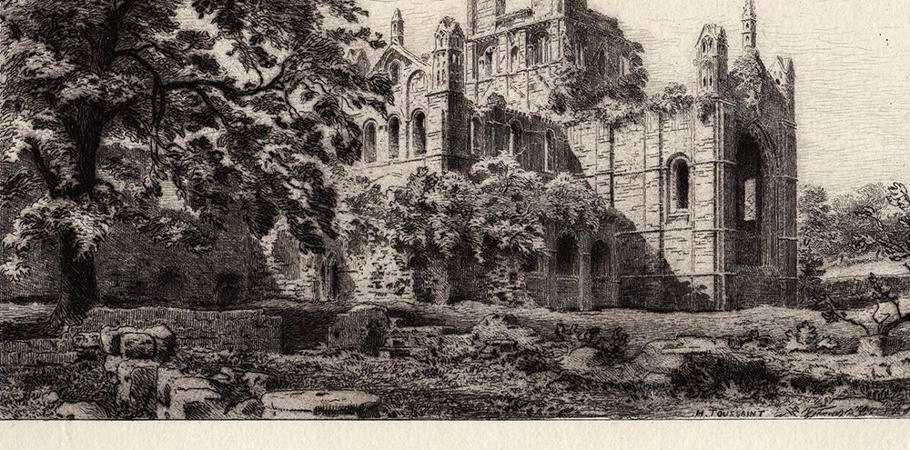Toussaint, Charles Henri (1849-1911). "Kirkstall Abbey, From the Southeast." Etching on laid paper. Signed in the plate lower right, 1882. This is not a modern print. The strike is crisp and the lines are sharp. (Plate Size 5 7/8 x 8 1/8 inches)  Comes with a Certificate of Authenticity.