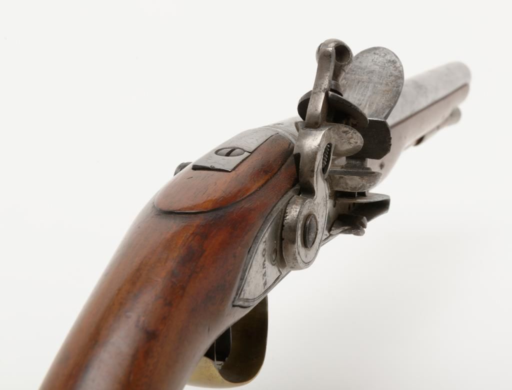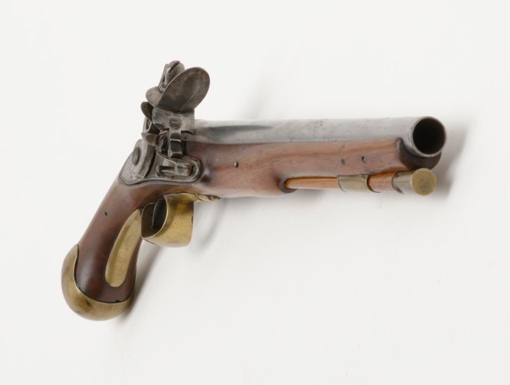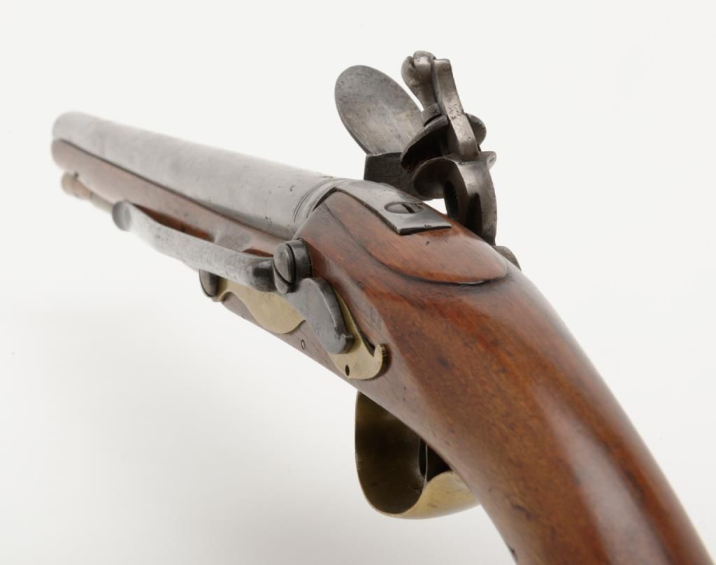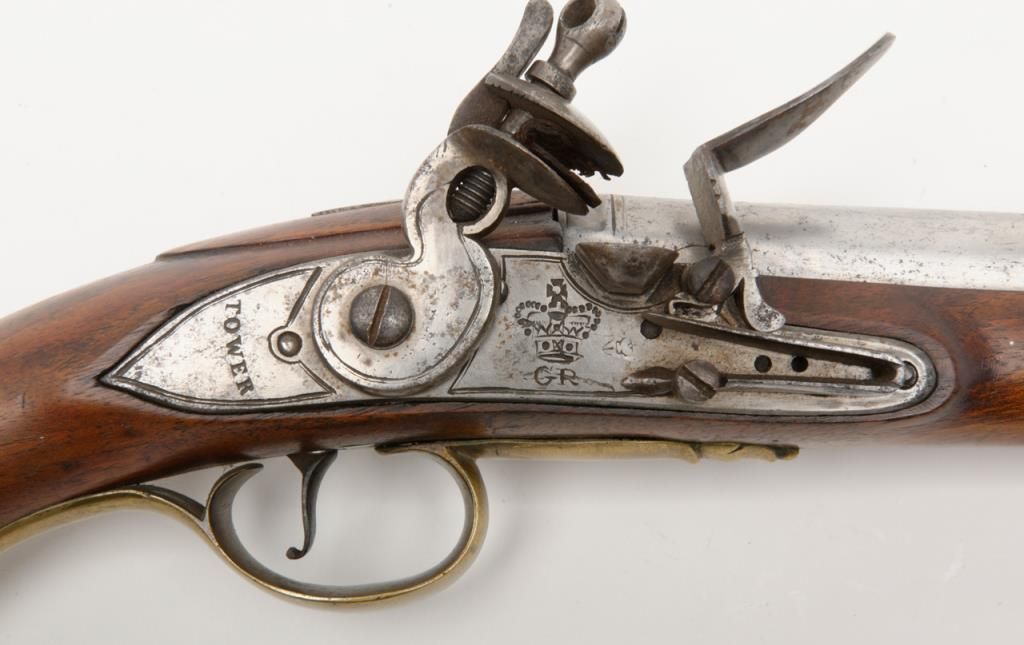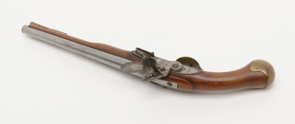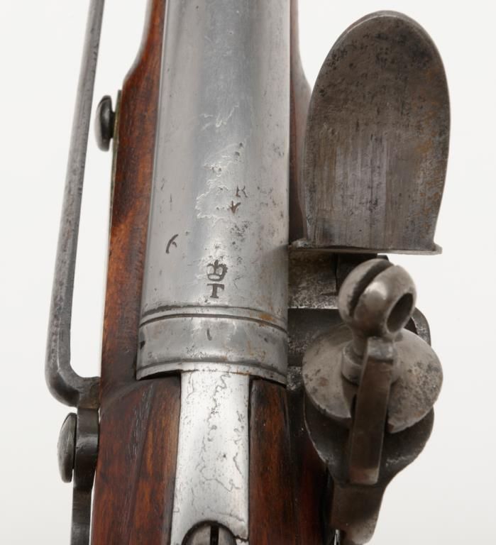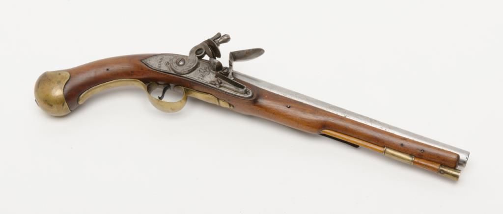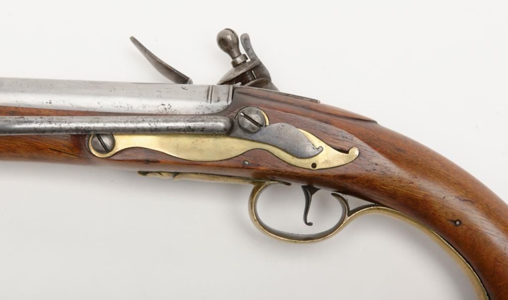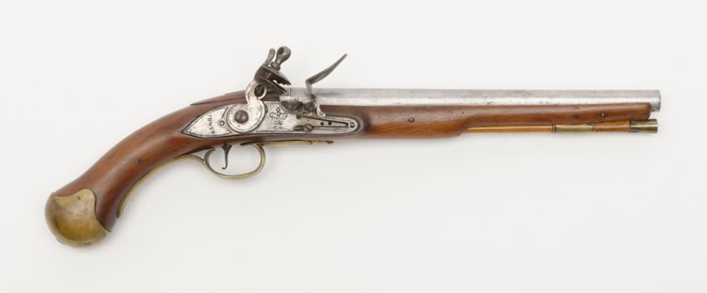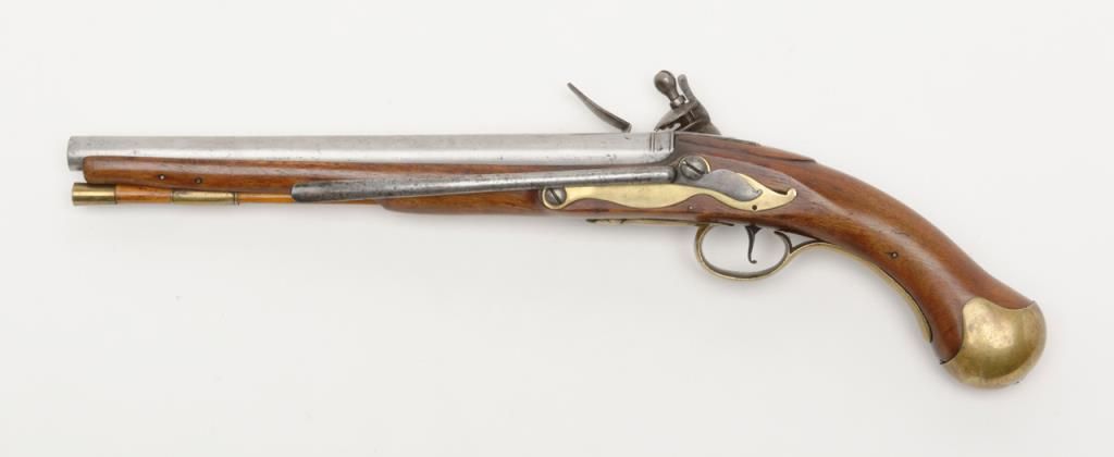 Tower Arsenal marked British Sea Service flintlock pistol circa late 18th century in .60 caliber smoothbore with approximately 11 ½” barrel and nearly 19” overall. Shows GR and crown along with broad head proofs on the lock and crown over Tproof at the center portion near breech and of the barrel. The lock and barrel show light cleaning and now aging back with some minor erosion and pitting just starting. The light-colored wood stocks have been slightly cleaned and also are atleast very good condition. A brass tipped wooden ramrod of the correct style is included and a correct style spring steel belt clip is also retained. There is a barely visible mark just behind the tip of the lazy S shaped side plate.The action works well and retains all of its original small parts and is in its original flintlock configuration. The collection of William A. Gary consigned by his estate. Est.: $1400-$2800