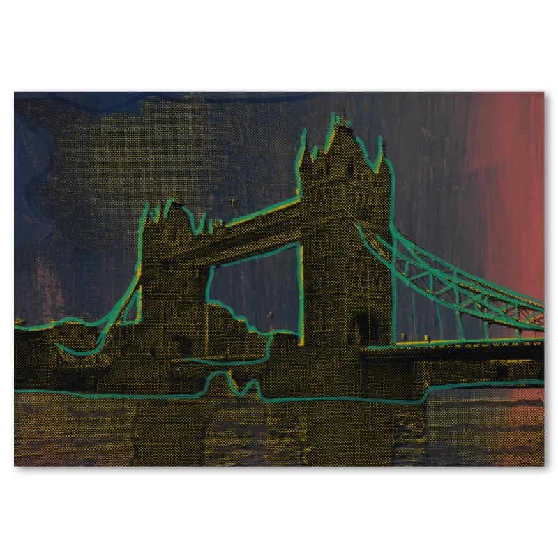"Tower Bridge" is a hand painted, hand pulled limited edition silkscreen on canvas by Andy Warhol protege, Steve Kaufman (1960-2010). This piece is Numbered 10/50 and hand signed inverso by the artist. This piece comes gallery wrapped. As is common with K