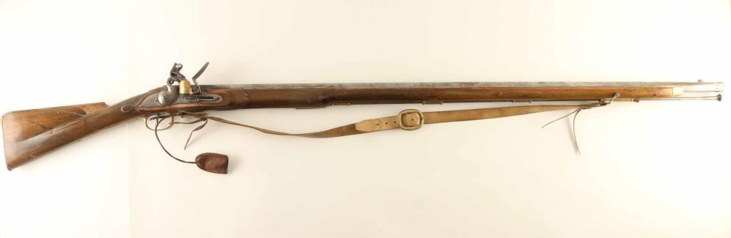 Reproduction flintlock smooth-bore, land Pattern Musket. In British military service 1722-1838. Standard Infantry rifle of the Crown forces in the American Revolution, War of 1812. 46" Round, smooth bore barrel with front sighting stud. Hardwood stock, with brass furniture. Brass tailed escutcheon on left stock. Brass shield behind tang. Steel ramrod in place. Brass butt plate. Lock plate marked "Tower", with Crown, "GB". 5 British proof marks on barrel, lock plate. A repro sling is attached to the sling swivels. Bore appears good, but dirty, with spots of surface rust. Stock appears to have been re-finished at some point. Its in good shape, with finish loss, scratches/dings. Metal has turned a gray patina, with some areas of surface rust. Two-cock hammer locks up tight. Someone has added a brass shield around the pan, for protection against the elements I assume. Also someone has added a piece of soft metal on the hammer, under the flint.