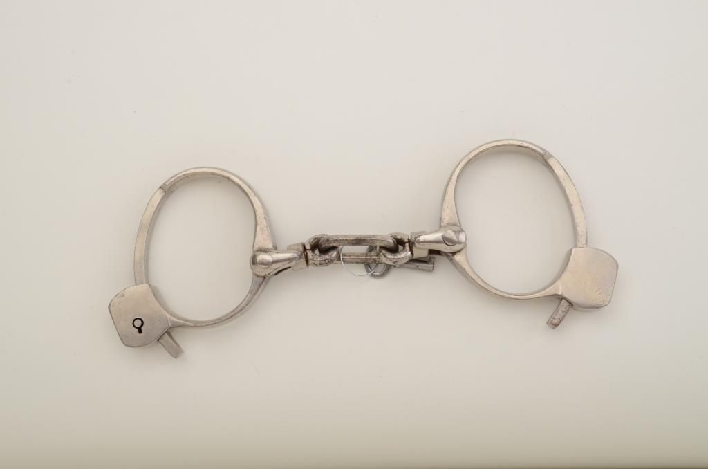 Tower Detective “Union Hardware Swivel Model” handcuffs, nickel plated, circa 1910, in overall very good condition, with key, working at time of description. From an old collection. Est.: $125-$250.