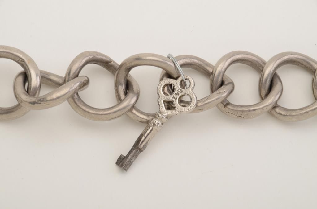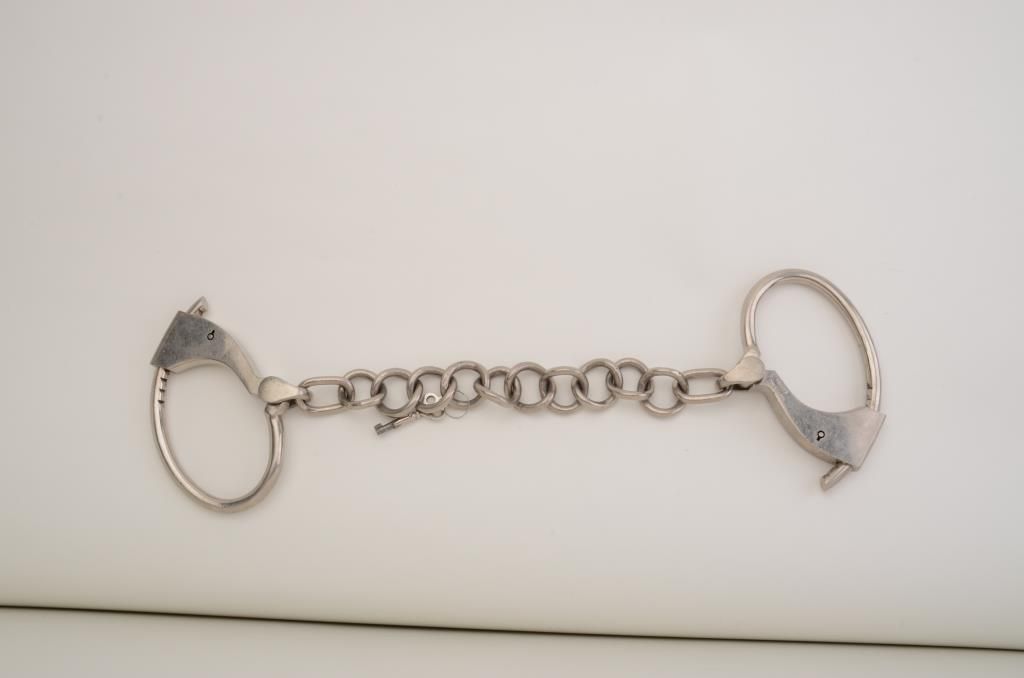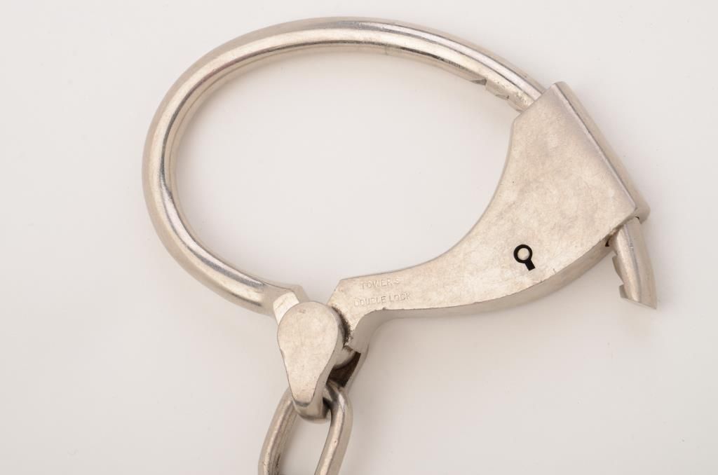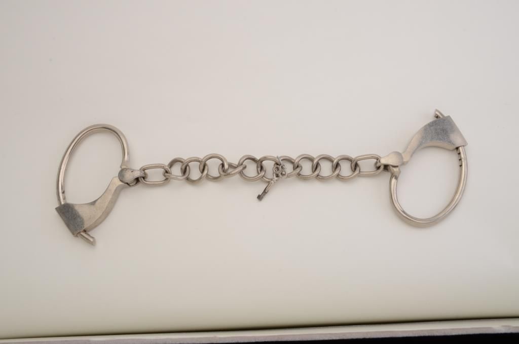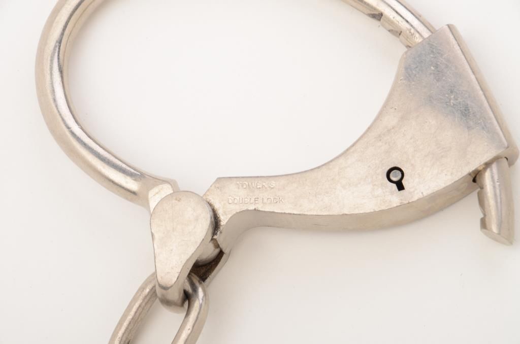 Tower Double Lock leg irons, nickel plated, with key, in very good condition and working at time of description, circa 1880’s. From an old collection. Est.: $200-$300.