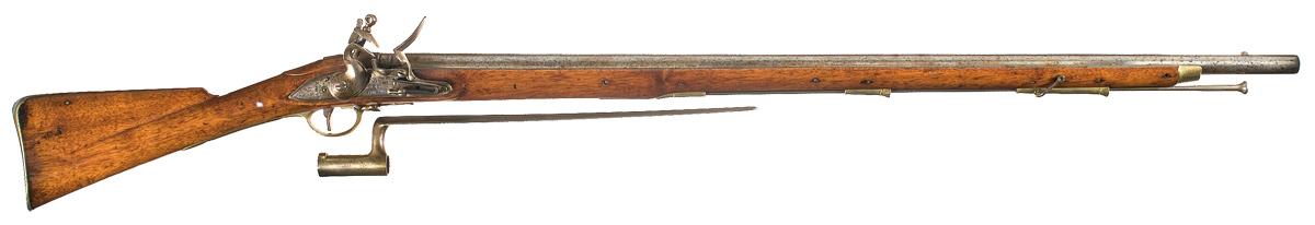 The barrel has a pair of British proofs on the left side at the breech, with a shallow groove rear sight and a worn down front sight on a bayonet lug. Border engraved lock plate, with "TOWER" marked vertically at the rear and the large crown over "GR" with a crown arrow proof and "I GILL" in front of the hammer. Smooth straight grip stock with brass forearm tip, ramrod pipes, trigger guard, reverse plate and butt, an iron ramrod with a button tip, and two sling swivels. The buttplate heel is marked "L-H 383" and "N /G17". "L-H 383" is also marked on top of the barrel. A crown/B proof is stamped on the left stock flat and illegible markings are stamped on the right side of the buttstock. With a socket bayonet (does not fit the musket).