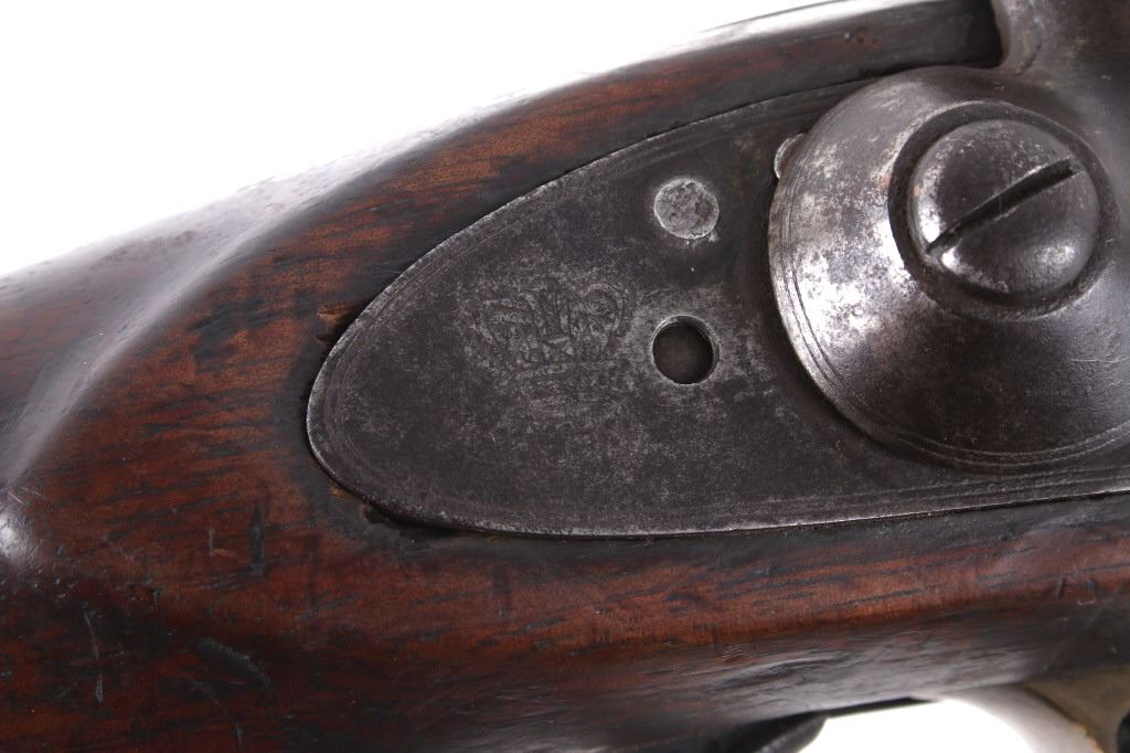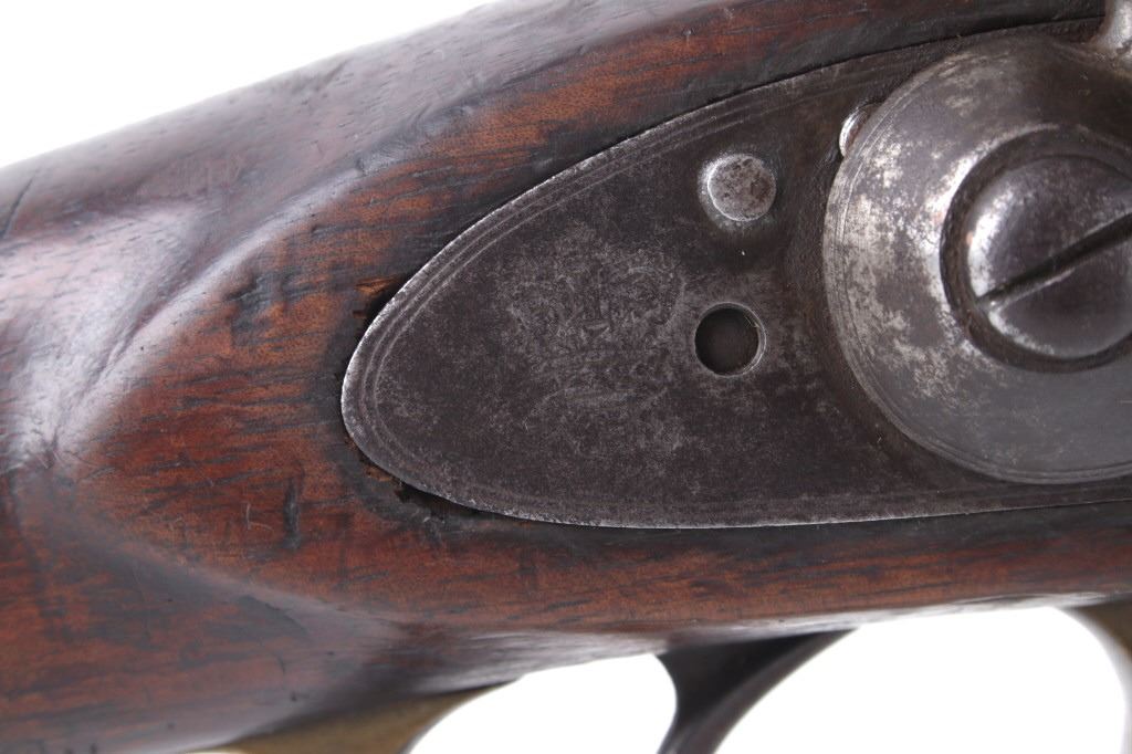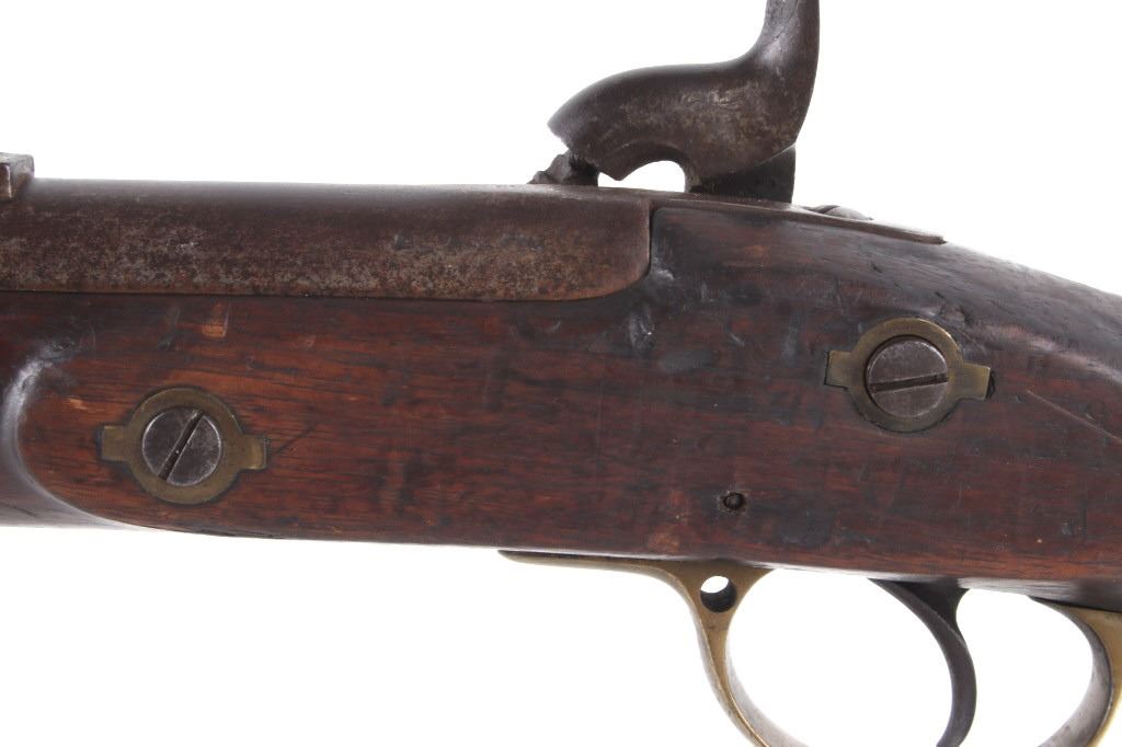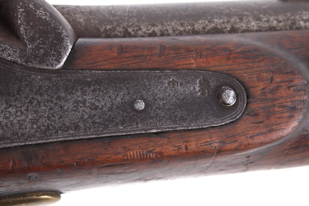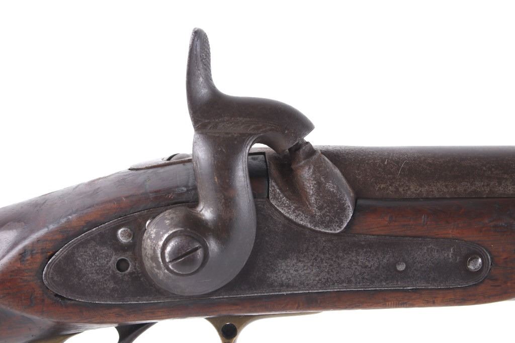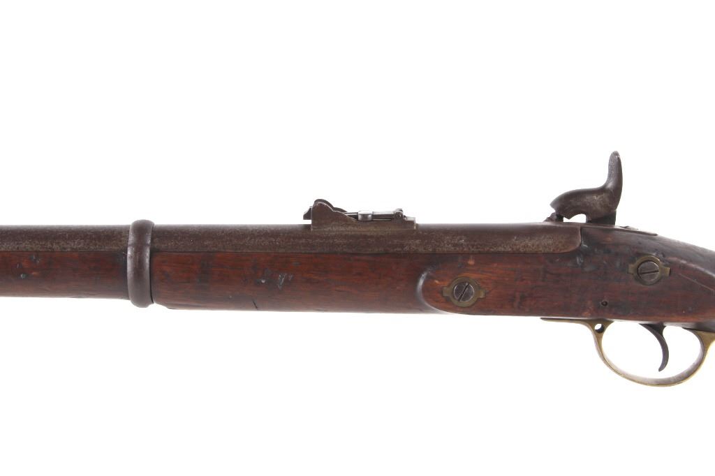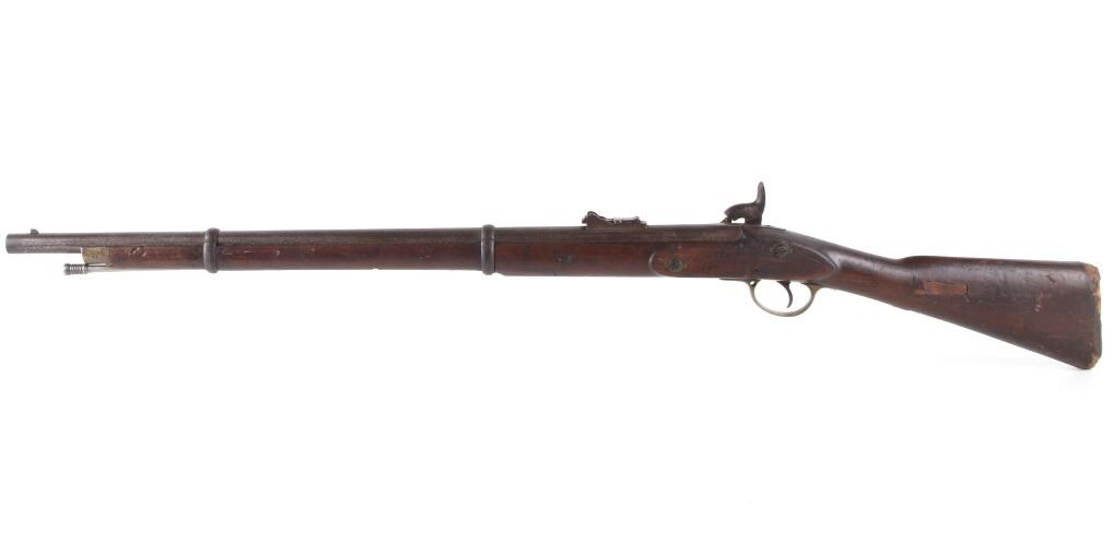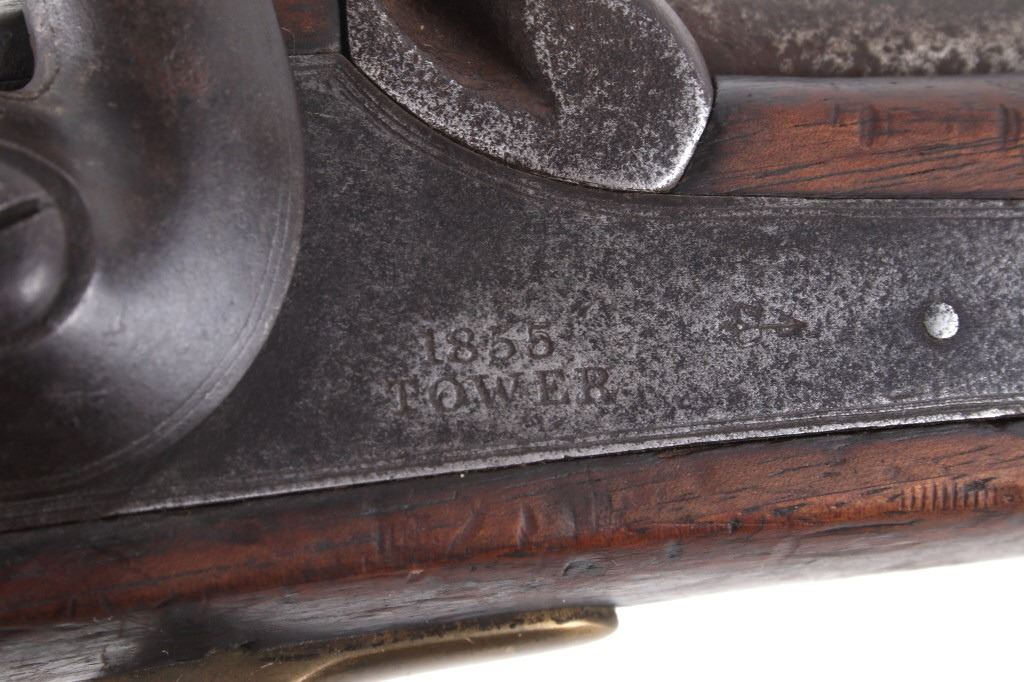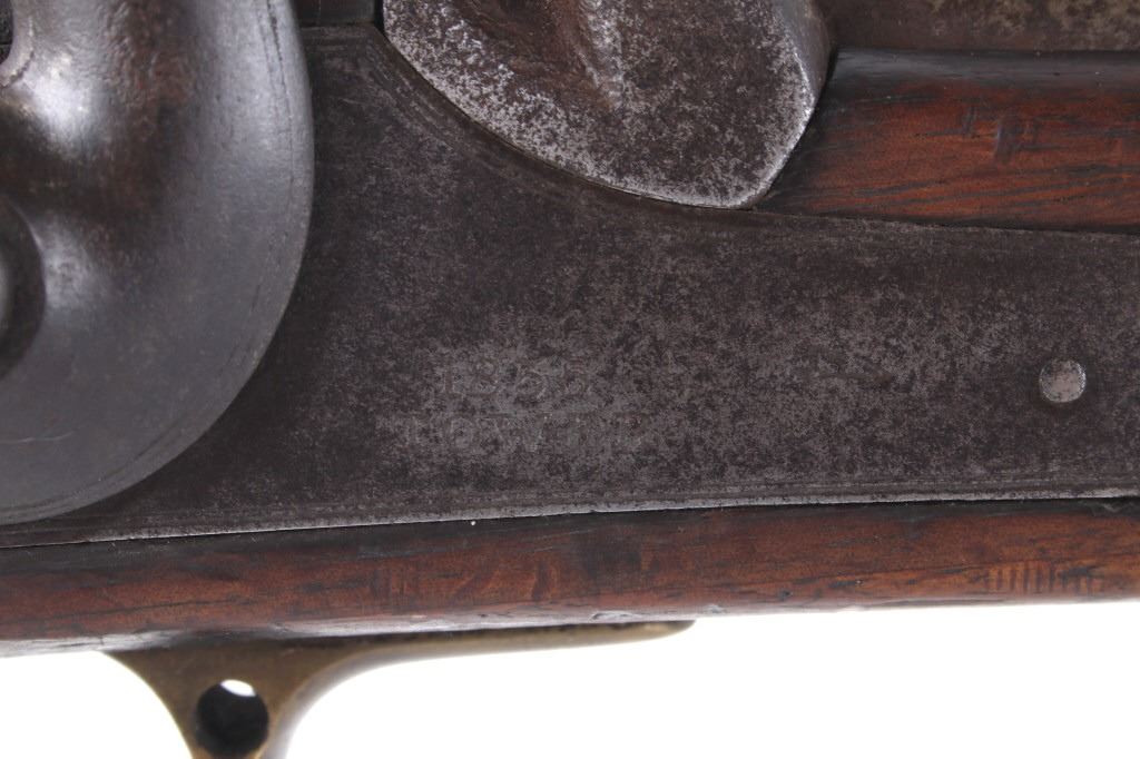 Featured in this lot we have a Tower Pattern 1855 percussion cap rifle chambered in .57 caliber. The rifle displays a 27 1/2" long barrel, walnut stock, brass trigger guard, under barrel ram rod, percussion cap action, and adjustable rear sight. The rifles lock plate is marked across the side with "1855 Tower" and a crown insignia, along with smaller proof marks. The rifle was manufactured in London for military use. The stock shows a few spots of repair and filled damage. Overall the rifle shows good condition for its age with the exterior showing wear due to age and use. This firearm qualifies as an Antique, and does not require FFL Transfer or NICS Background Check.