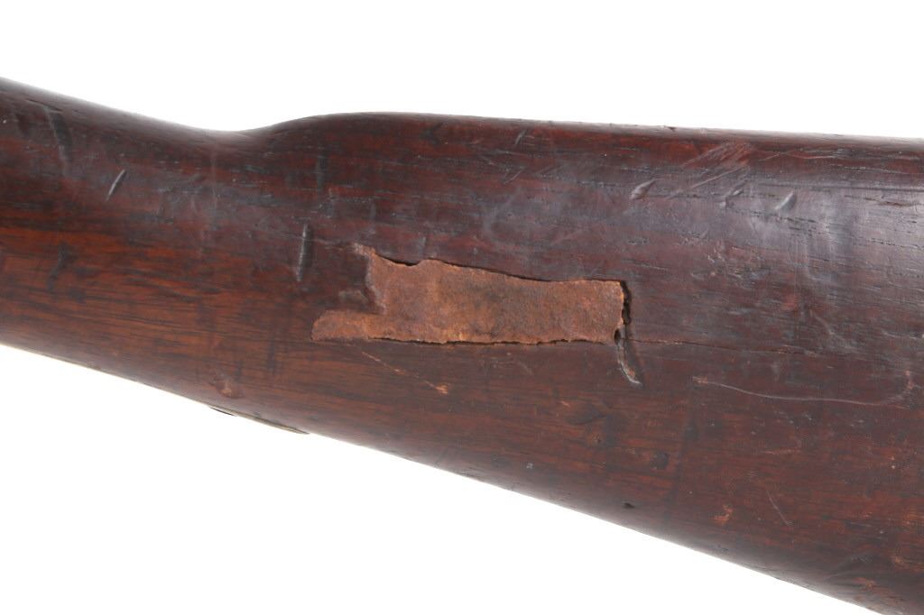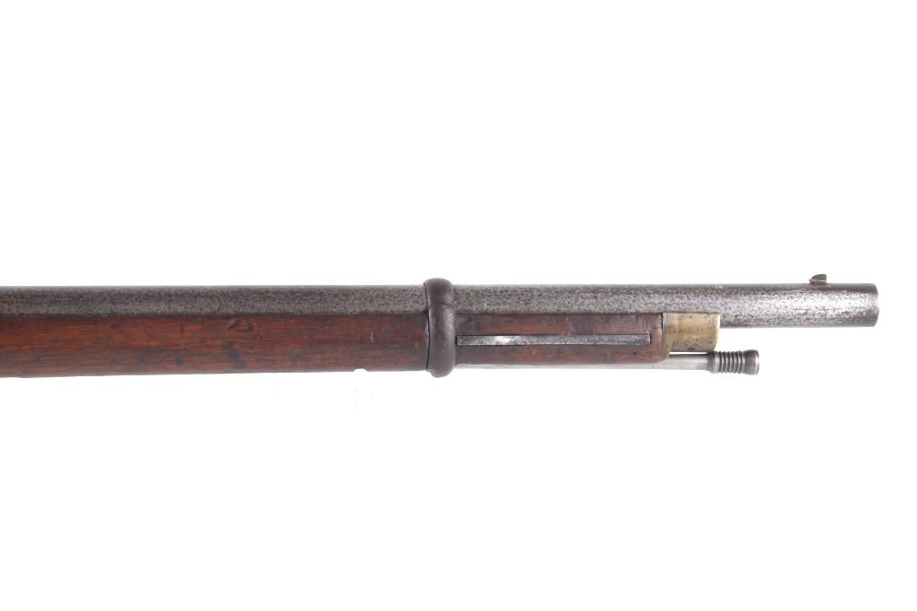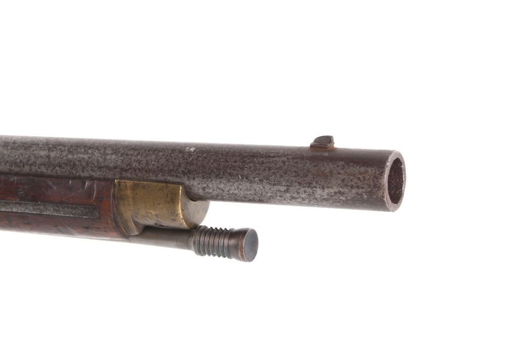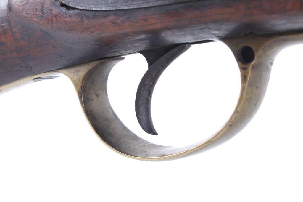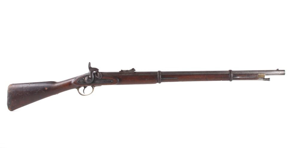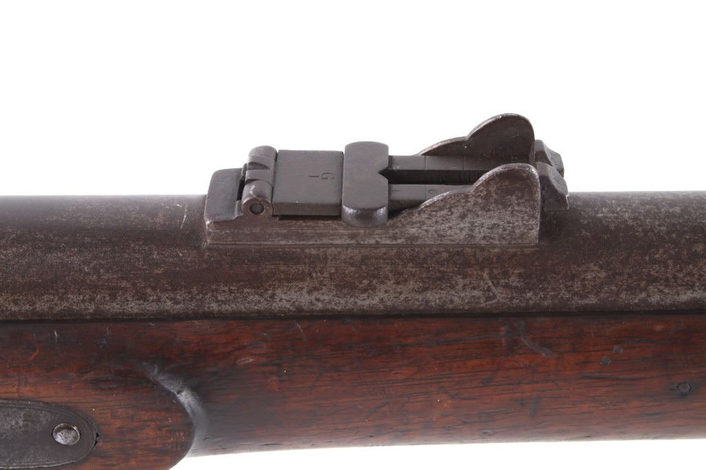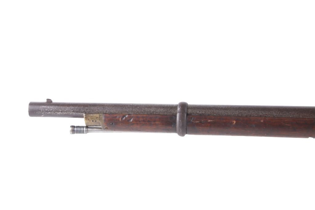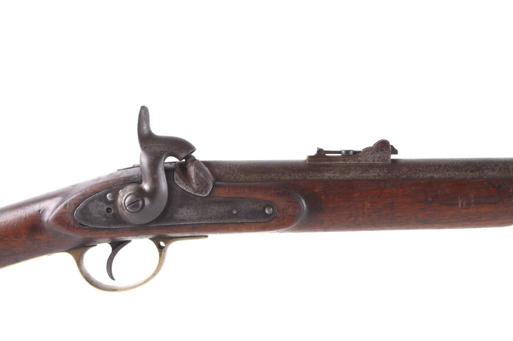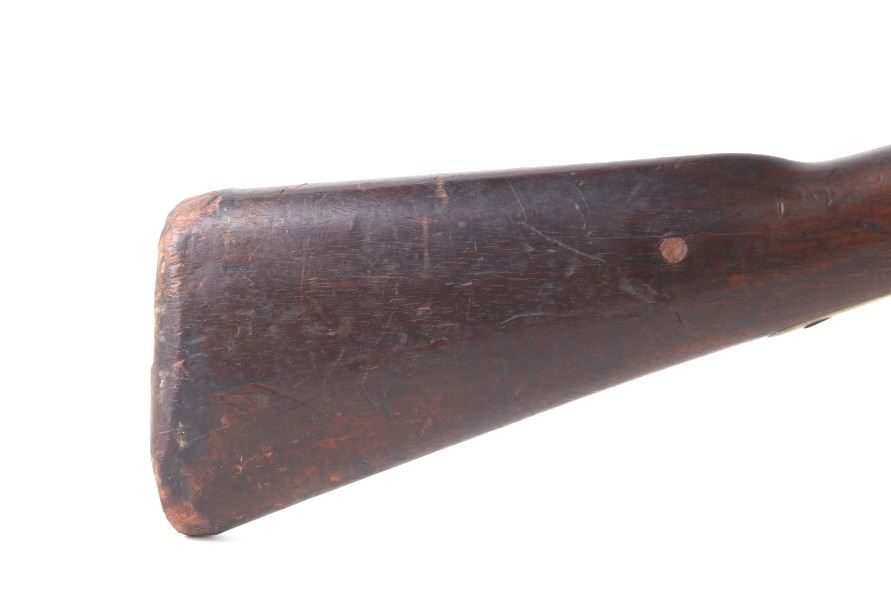 Featured in this lot we have a Tower Pattern 1855 percussion cap rifle chambered in .57 caliber. The rifle displays a 27 1/2" long barrel, walnut stock, brass trigger guard, under barrel ram rod, percussion cap action, and adjustable rear sight. The rifles lock plate is marked across the side with "1855 Tower" and a crown insignia, along with smaller proof marks. The rifle was manufactured in London for military use. The stock shows a few spots of repair and filled damage. Overall the rifle shows good condition for its age with the exterior showing wear due to age and use. This firearm qualifies as an Antique, and does not require FFL Transfer or NICS Background Check.