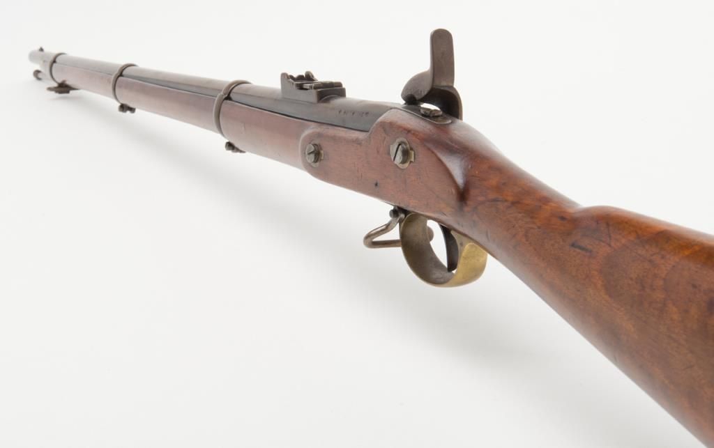 Tower marked Enfield pattern .58 caliber 3 band rifled musket dated 1861 with brass mounts in good to very good original condition. The metal surfaces show a smooth brown patina with some traces of original finish mixed in. There is someminor pitting in the area of the breech. The stock is good to very good with a better than average grain and just some minor scratches, marks and minor imperfections with only a few slight losses along the ramrod channel. There is no evidence ofinspection marks anywhere on the stock. An original to the period bayonet and ramrod are included. The lock is well marked with Crown, date and Tower. The left side of the breech shows the number “24” and British proofs. Many of these were imported and used by both sides during the Civil War. Good action, good bore and good overall Est.: $700-$1400