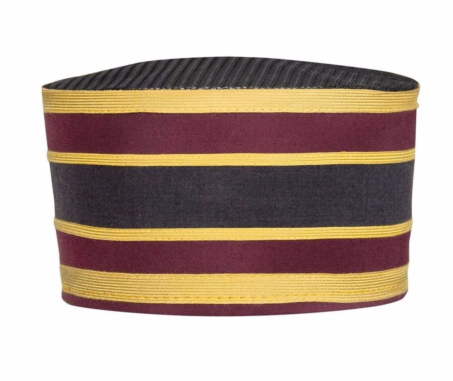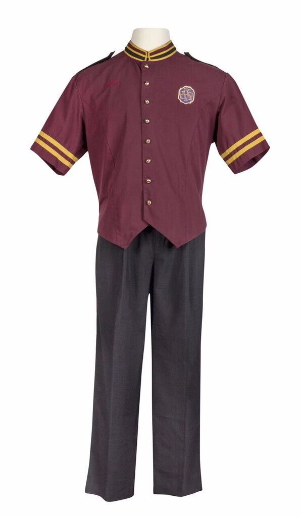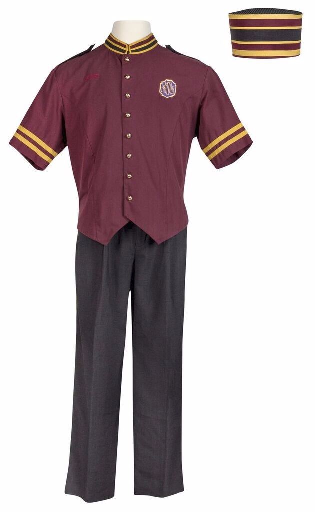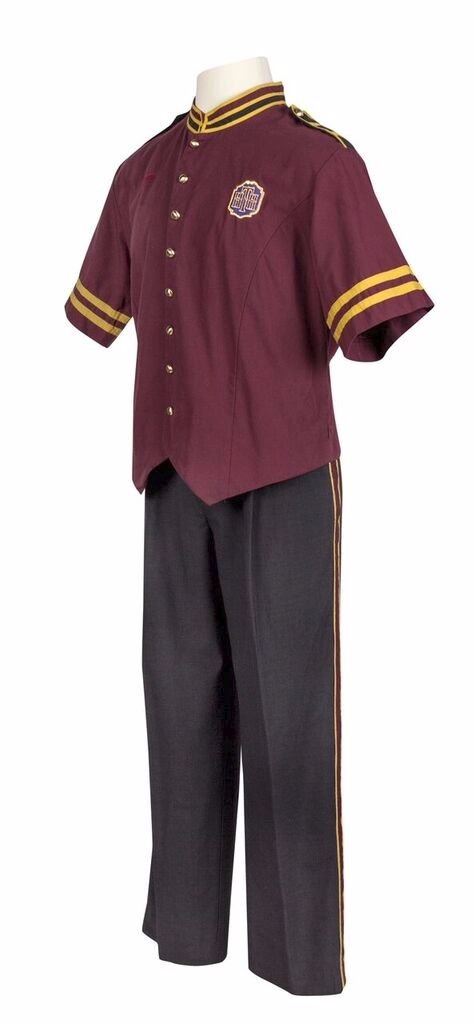 (Disney-MGM Studios, c.2000) An original male cast member costume from the "Hollywood Tower of Terror" at Disney-MGM Studios. This costume includes the hat, shirt, and pants which feature the iconic red, black ,and gold pattern that the attraction is well-remembered for. The shirt is a size 44L, the pants are a 32x34, and the hat is a large. These items retain their original Disney wardrobe tags, and the hat has the word "studio" written inside. This set is in very good condition with some minor wear throughout from park use.