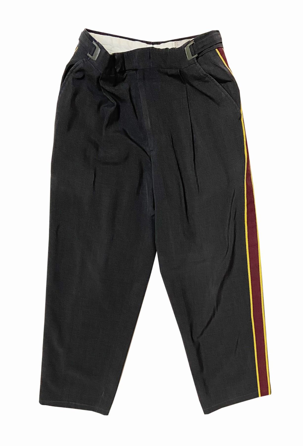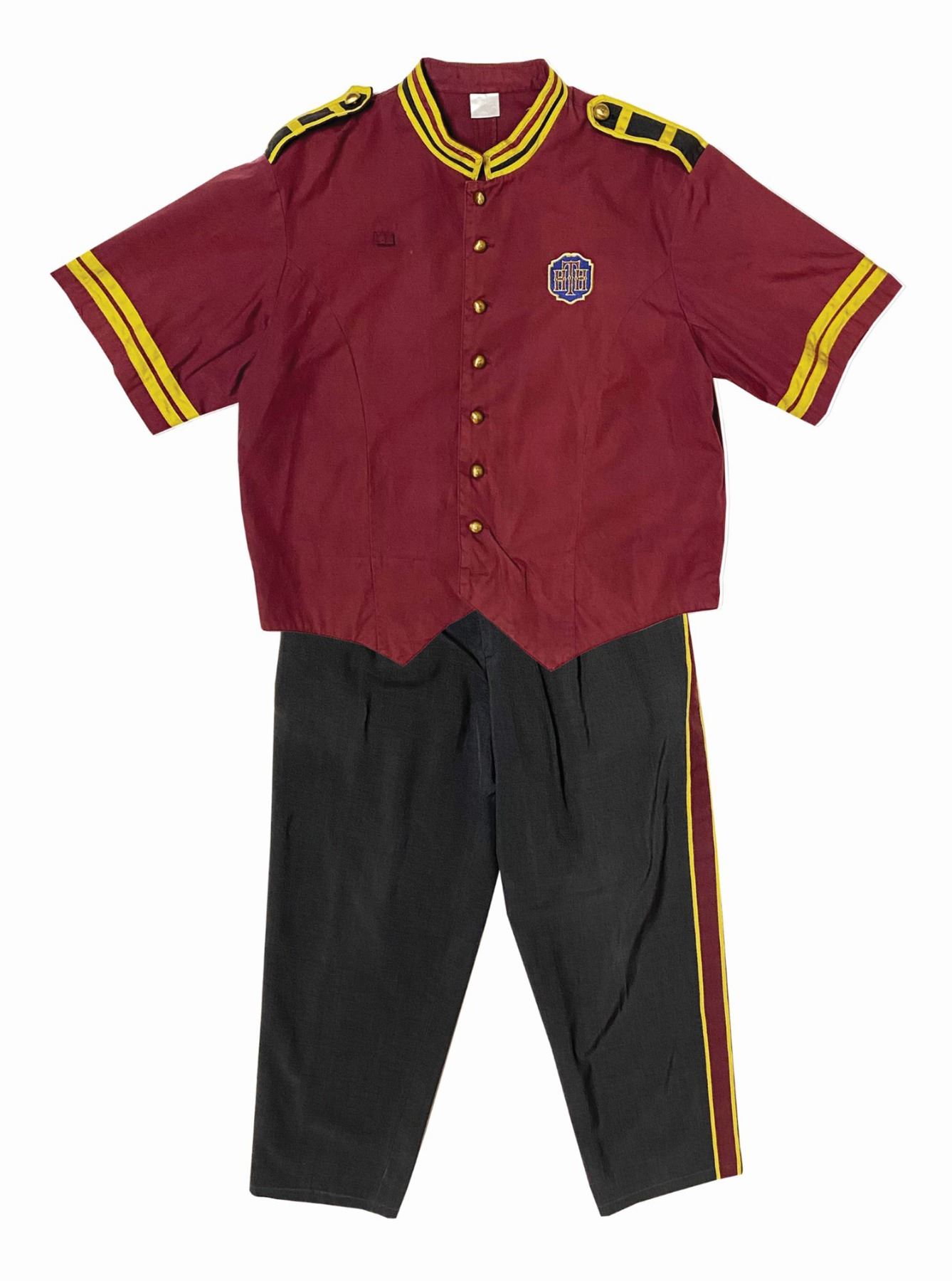 (Disney-MGM, c.1999) An original male cast member costume from the Tower of Terror at Disney-MGM Studios. Featuring the popular red, black, and gold pattern that is well-remembered by fans of the attraction, this costume includes both a size 42L shirt, and the pants which are marked as 30/32 x 28. These items still retain their inner Disney wardrobe department tags and have a few hand-written notes inside that indicate their Disney-MGM Studios use. The costume is in good overall condition with expected wear throughout from use, including some fading to the pants.