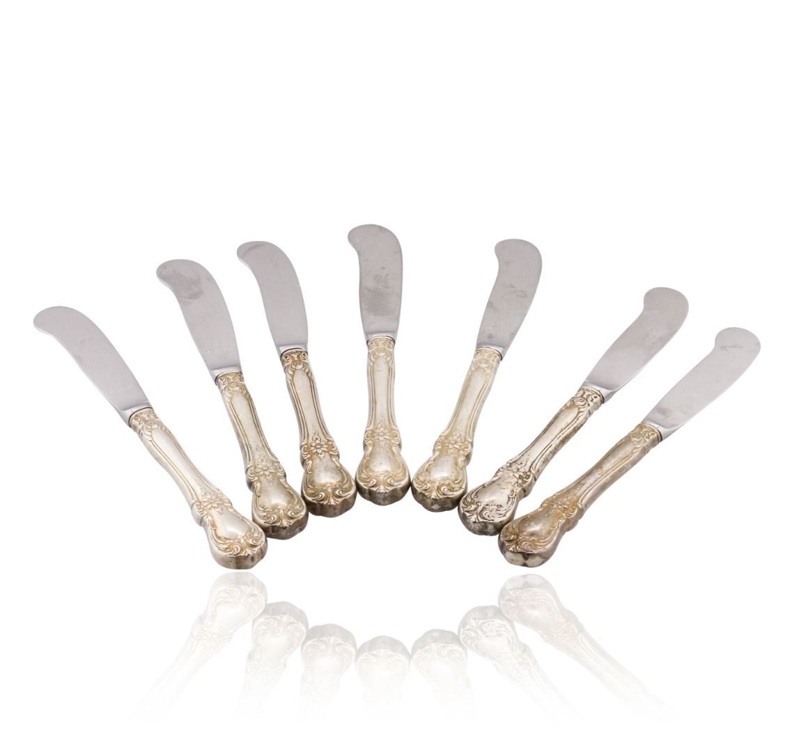 Set of 7 sterling silver hollow handles butter spreaders by Towle. Condition is excellent. Old master pattern. Marked on blades with the makers mark for Towle, STERLING handle, Stainless blade. 5 7/8'' in length. No monograms.