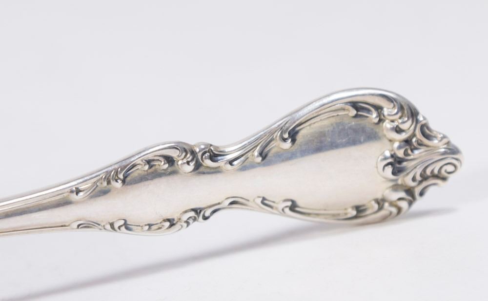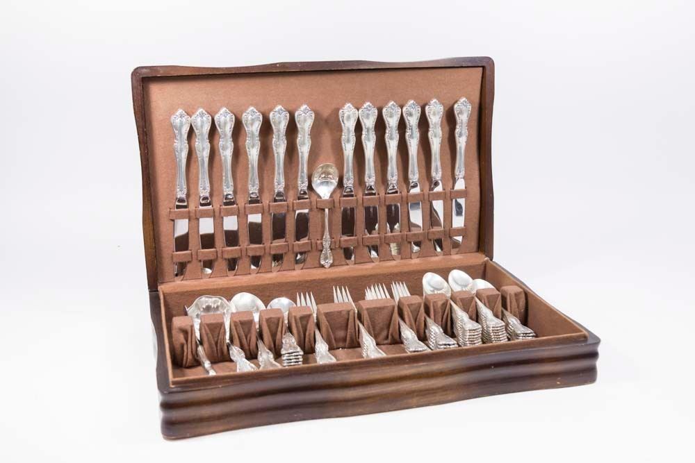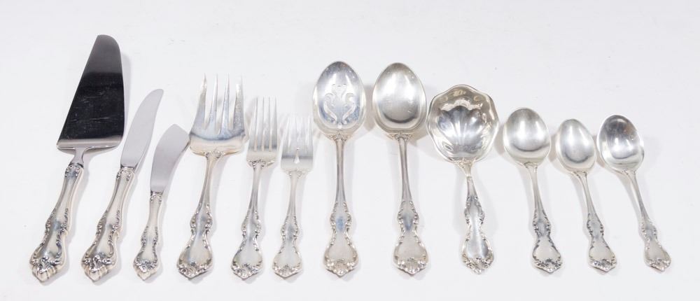 Service for 12 with 7 serving pieces. Including 12 forks, knives, soups, salad forks, and 24 teaspoons. 79 pieces total. Approx. 115 ozt.