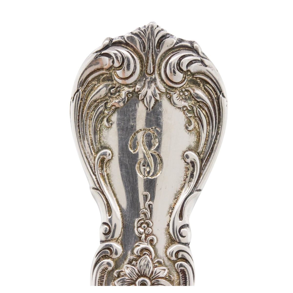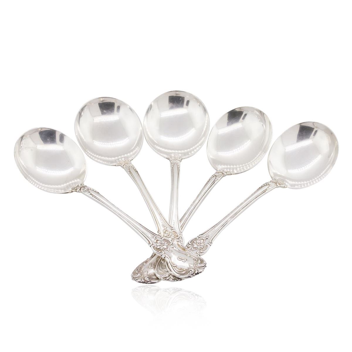 5 Towle Sterling old master round soup spoons measuring 6''. Each piece is in very good estated (used) condition. Monogrammed with beautiful period script "B".