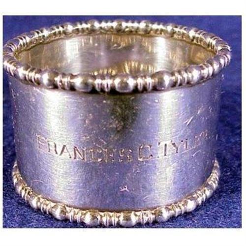 This Towle sterling napkin ring is 1 7/8" high and 1 1/4" in diameter. It is marked sterling on the inside along with the Towle logo and the number 8680. The beaded edge makes the napkin ring very attractive. The ring is engraved "Frances C. Tyler" .