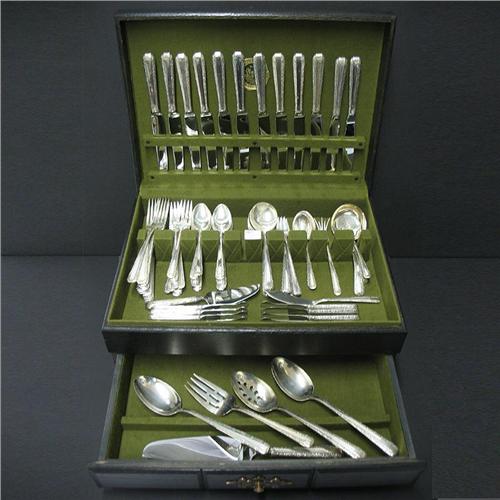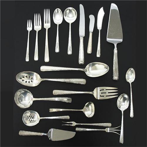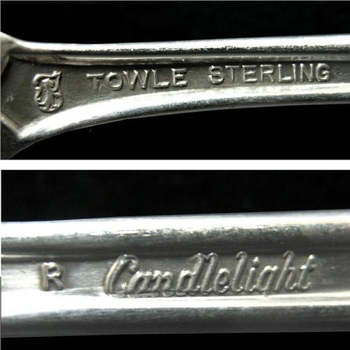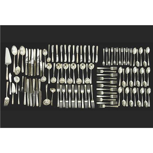 Towle sterling silver flatware set "Candlelight" service for twelve including twelve dinner knives; twenty-three teaspoons; eleven soup spoons; twelve dinner forks; twelve salad forks; twelve cocktail forks; twelve butter spreaders; olive fork; lemon fork; butter knife; sugar spoon; tomoto server; small serving spoon; soup ladle; gravy ladle; two large serving spoons; cake server; cheese server; large pierced serving spoon; and a cold meat fork; C.1934; no visible defects