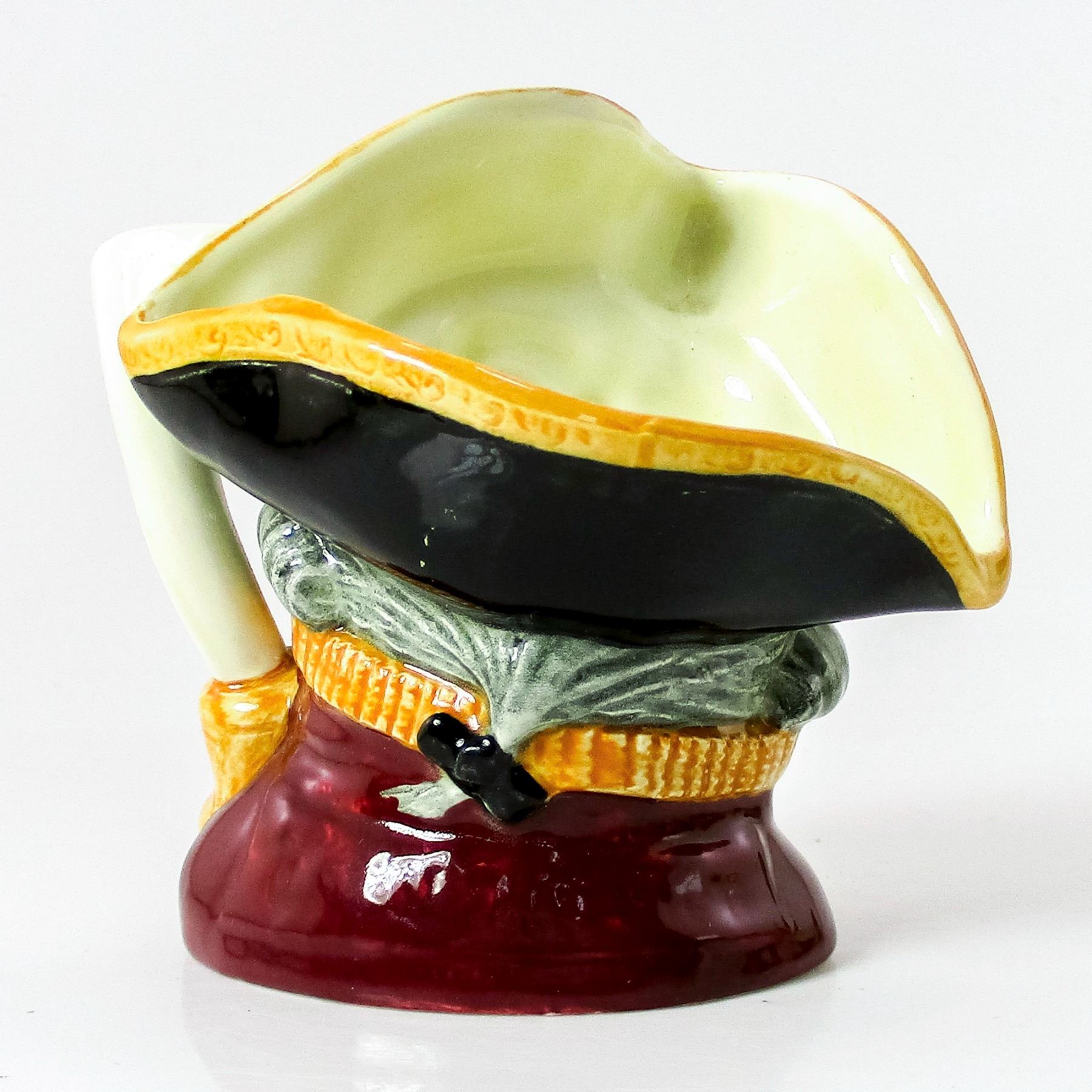 Style One, bell on scroll handle. Black hat trimmed with gold; scarlet coat trimmed with gold. Royal Doulton backstamp.