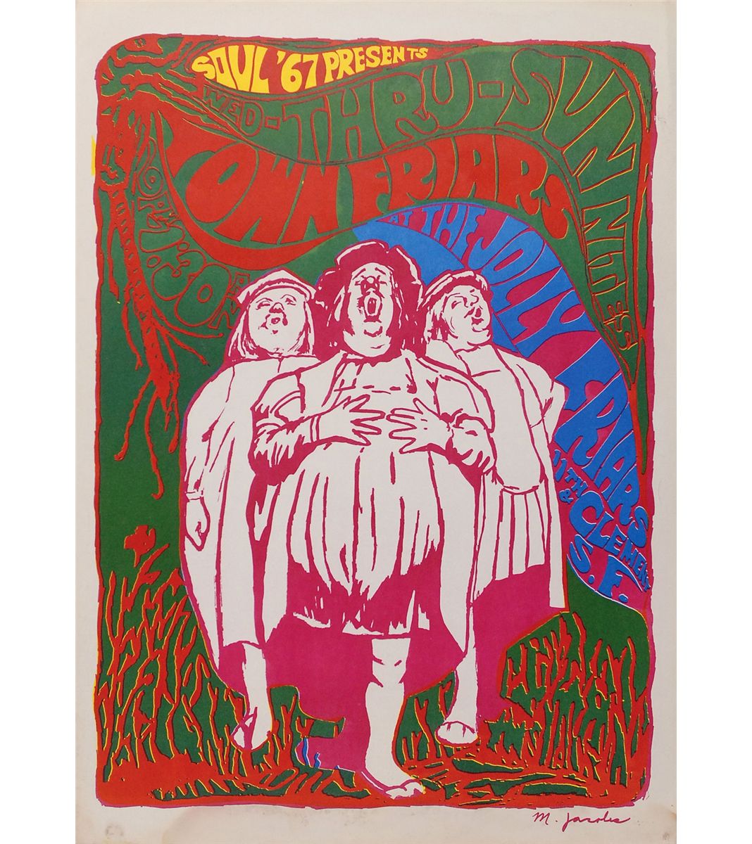 Uncommon color 14 x 20 concert poster for the Town Friars show at the Jolly Friars in San Francisco, presented by Soul ‘67, and featuring artwork by M. Jacobs. Scattered toning and soiling, mostly to borders, as well as some edge and corner creases, otherwise fine condition.