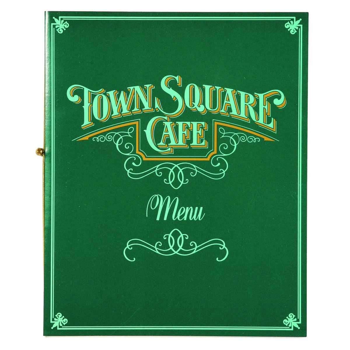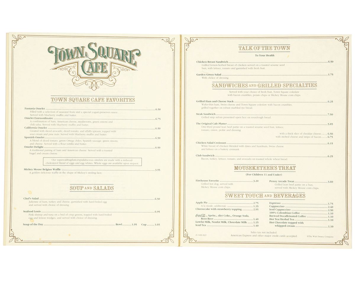 (Disneyland, 1980s) An original green version of the fold-over menu from the Town Square Cafe at Disneyland. Features the Town Square Cafe logo on the front, with a description of the “Story of Main Street” written along the inner-left cover. A gold-colored cord keeps the inner menu prices page in place. Measures 10”x8” closed and 10”x16” opened. In good condition with minimal wear from use.