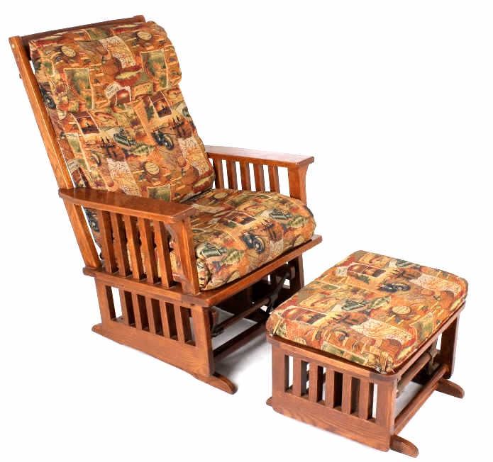 For sale in this lot we have a Towne Square oak glider rocking chair with glider footstool. Both the chair and footstool are constructed out of oak with fishing fabric upholstery and aluminum brackets. The chair and footstool where manufactured in 1998 from Hillsboro, Texas. The chair and stool are in very good condition showing great smooth rocking action and little to no signs of damage. The chair measures 42 1/2" tall by 28" wide by 27" deep and the footstool measures 22" wide by 16 1/2" deep by 15 1/2" tall.