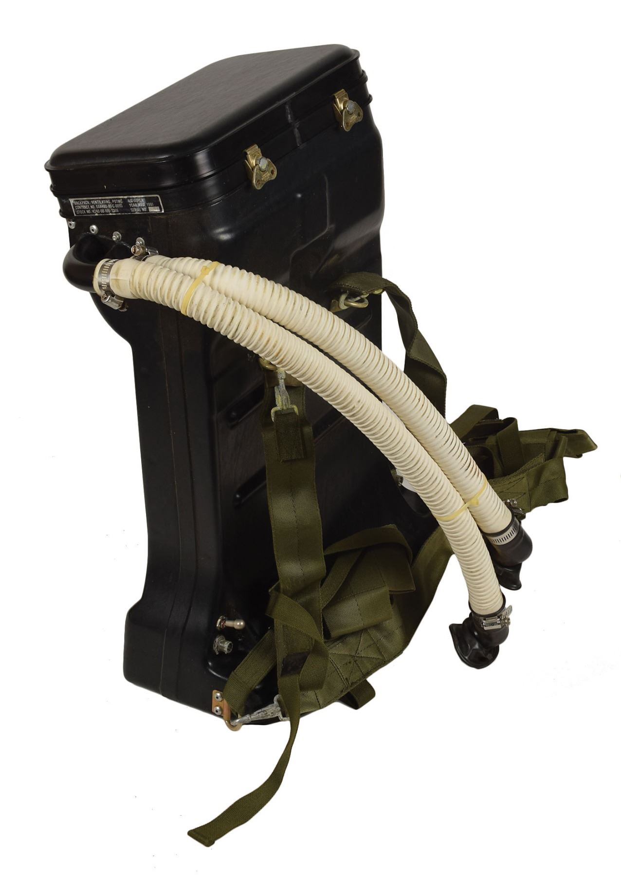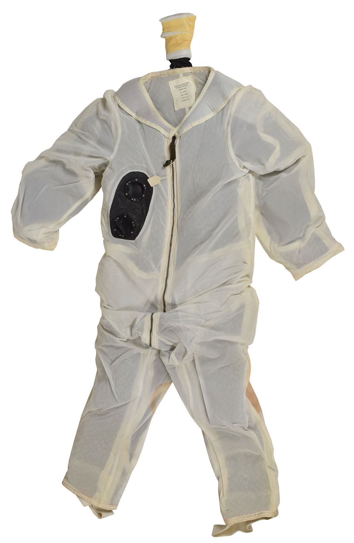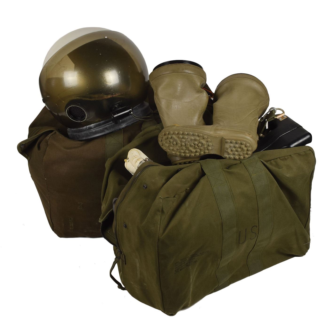 Protective Outfit Toxicological Microclimate suit by Lite Industries, size small, unused, consisting of helmet assembly, protective coveralls liner, beige zip-up liner, and butyl rubber outer suit with two rubber sealing zippers providing front access and closure; suit contains sealing air inlet disconnect for attachment to hose assembly of backpack and connection with liner, as well as six one-way exhaust valves. Manufacturing tag lists manufacturing date of September 1982, and an inspection test date of September 1985. Includes the backpack ventilation assembly with hoses and belt straps, and matching butyl rubber boots, size 7, with passing leak test stamps; the backpack's gas/particulate filter is not present. Both the suit and backpack assembly are accompanied by original military-grade canvas duffle bags with warning labels. In fine condition. Accompanied by the original Lite Industries contents list. Inspired by the suits of the Apollo astronauts, these suits were designed for workers dealing with highly toxic materials, with certain types intended for handling noxious rocket fuels.