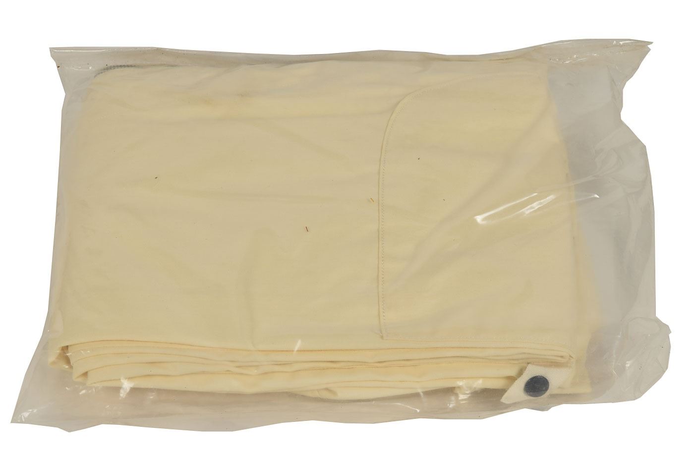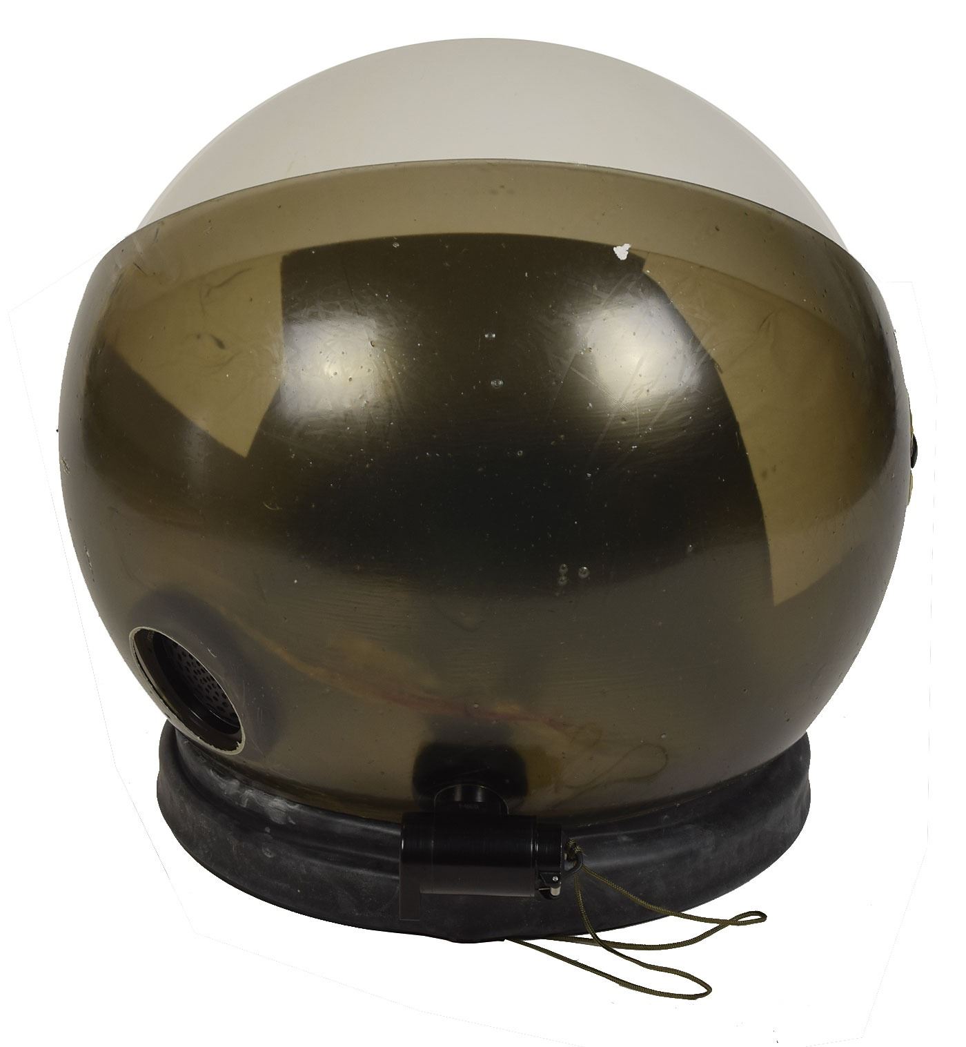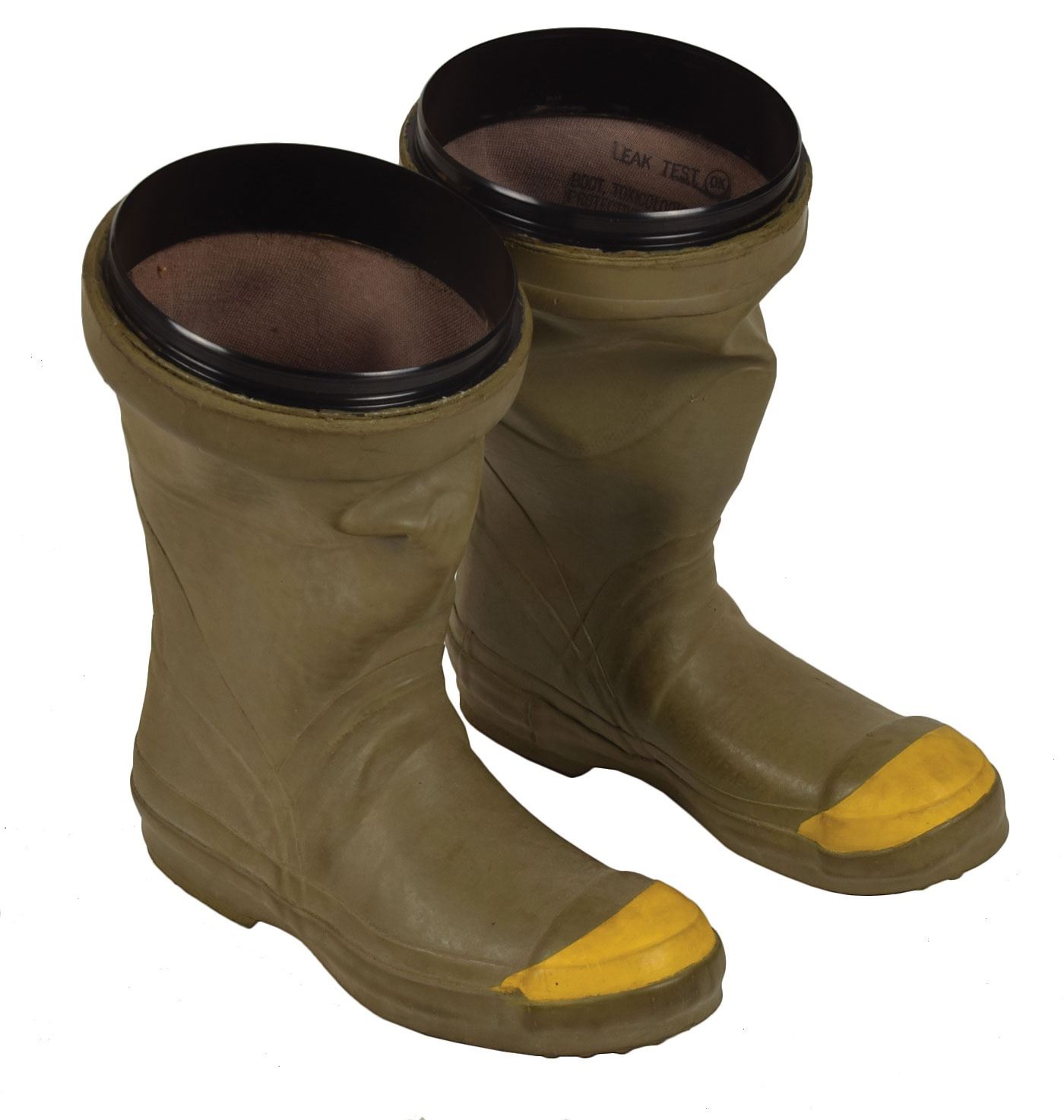 Protective Outfit Toxicological Microclimate suit by Lite Industries, size small, unused, consisting of helmet assembly, protective coveralls liner, beige zip-up liner, and butyl rubber outer suit with two rubber sealing zippers providing front access and closure; suit contains sealing air inlet disconnect for attachment to hose assembly of backpack and connection with liner, as well as six one-way exhaust valves. Manufacturing tag lists manufacturing date of September 1982, and an inspection test date of September 1985. Includes the backpack ventilation assembly with hoses and belt straps, and matching butyl rubber boots, size 7, with passing leak test stamps; the backpack's gas/particulate filter is not present. Both the suit and backpack assembly are accompanied by original military-grade canvas duffle bags with warning labels. In fine condition. Accompanied by the original Lite Industries contents list. Inspired by the suits of the Apollo astronauts, these suits were designed for workers dealing with highly toxic materials, with certain types intended for handling noxious rocket fuels.