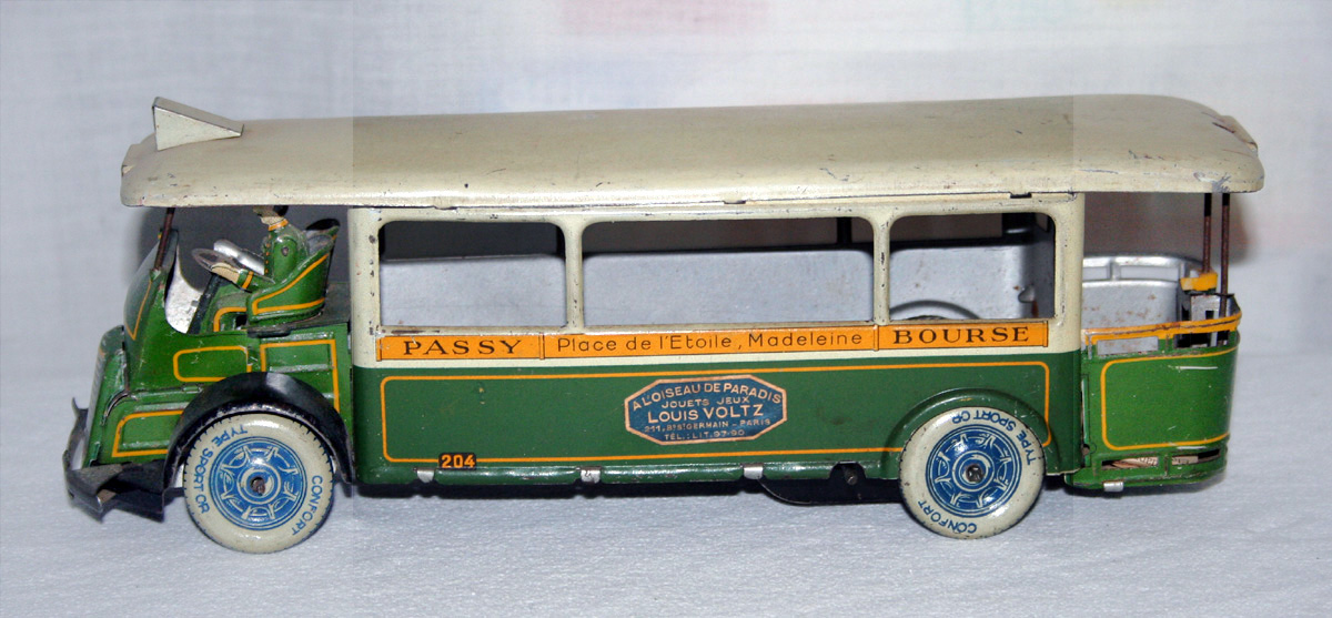Toy Open air Autobus with driver made in France. Approx. 11.5” long. Moderate wear and discoloration commensurate with use and age. Key wind. Key not original. Decal on side reads: Aloiseau de paradis Louis Voltz. Paris. Tel: Lit.97 90. Working condition.