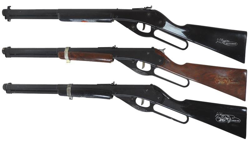 Toy BB guns (3), all J.C. Higgins BB guns mfgd for Sears Roebuck by Daisy Mfg Co., includes "Westerner" Model 799-2990, Cactus Carbine-Model 799-2029 & Cactus Carbine Model 799-2039, ea w/plastic stock & forearm w/metal barrel, trigger, etc, all VG cond & 36"L.