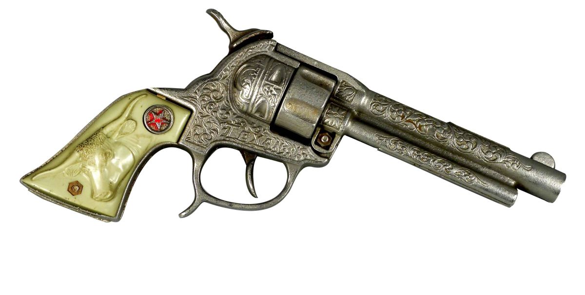 Toy Cap Pistol, "The Texan". Nickel plated iron with steer head embossed plastic grips. Excellent working condition. 4 inch barrel.