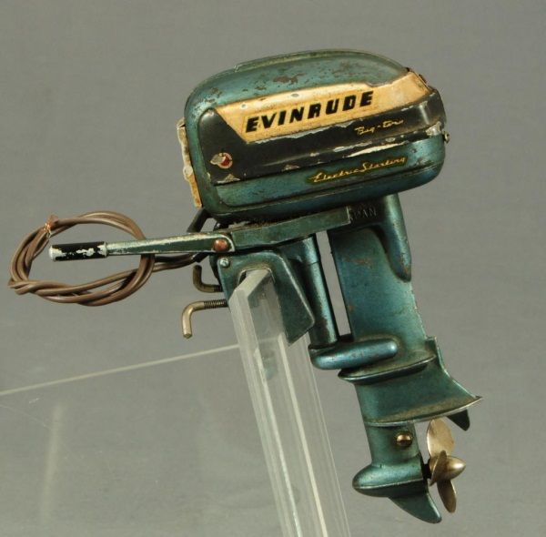 Electric Evinrude toy motor. 5.5' long, 3' wide. Appears to be in working condition.