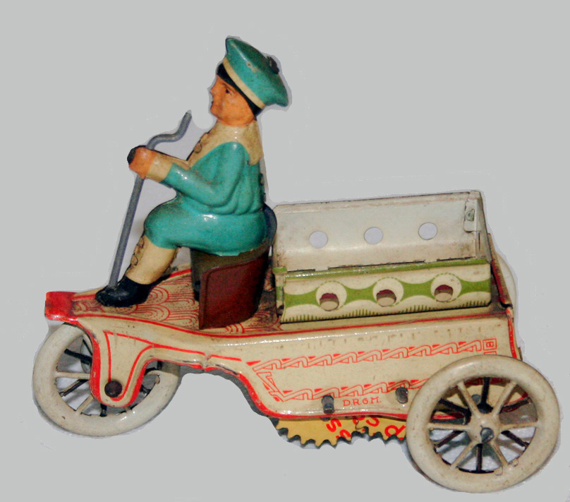Tin toy – Figure in three wheel cart. Made in Germany. DRGM. Key wind. Slight discoloration commensurate with age. Working condition.