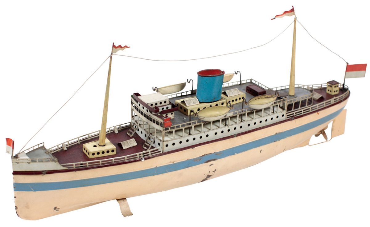 Toy, Gebruder Fleischmann clockwork ocean liner, Model 856, catalogued by FAO Schwarz in 1950's, met