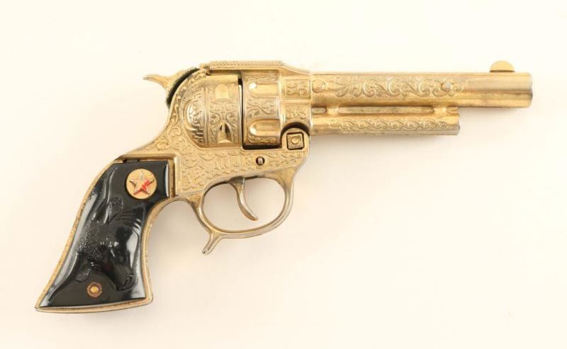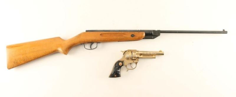 "The Minuteman" BB gun with wood stock, some scratches on barrel and a "Texan Jr" gold metal cap pistol with black plastic steer head grips.