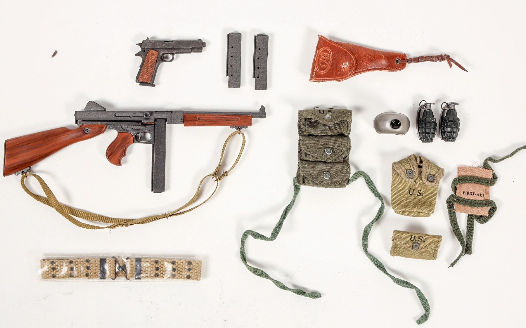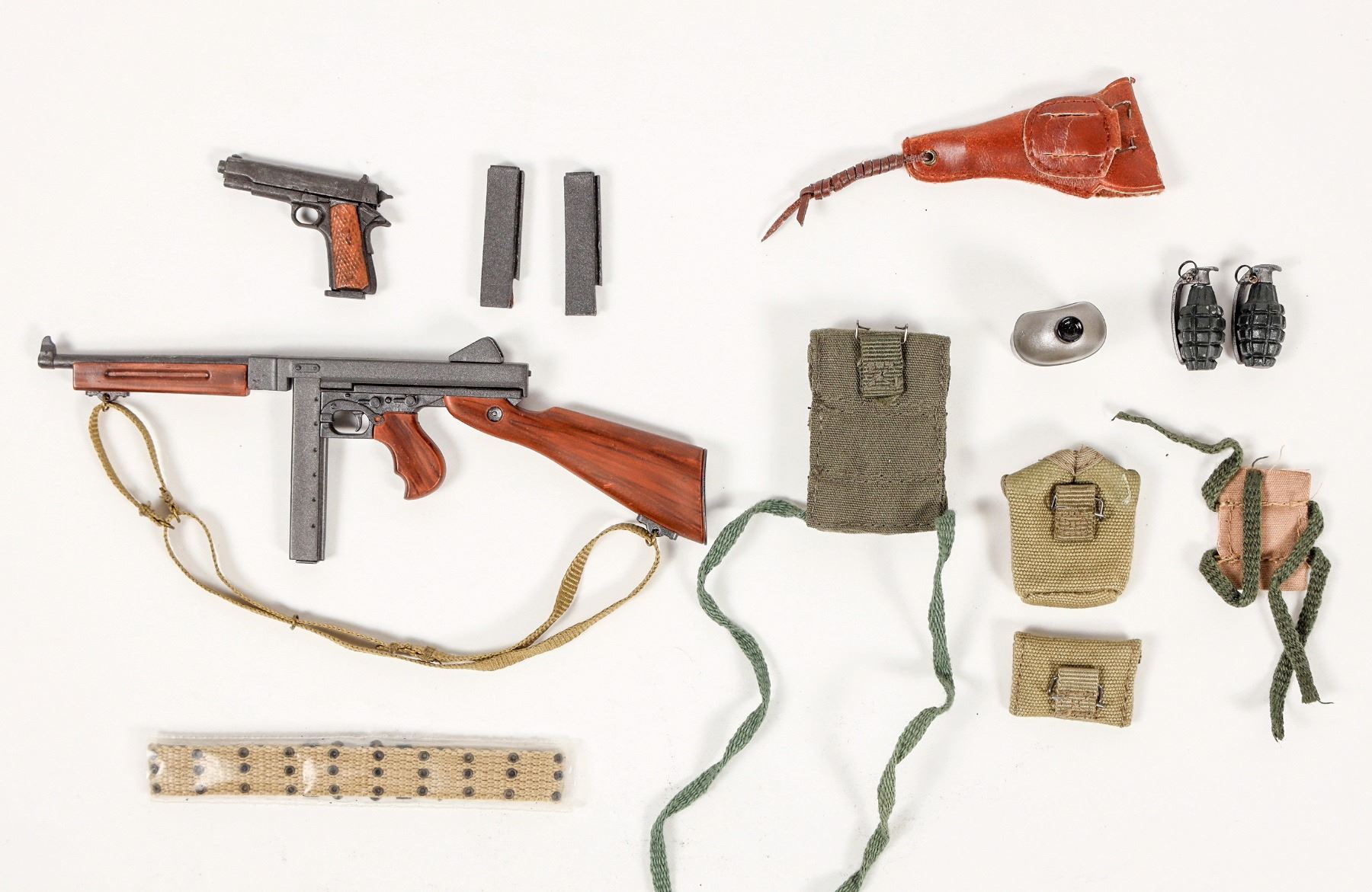 Vintage toy soldier gear: tommy gun (5 1/2 inches long) with shoulder strap; 45 pistol in leather holster (2 inches long); two hand grenades (1/2 inch long); belt, first aid, U. S. canteen and holder.