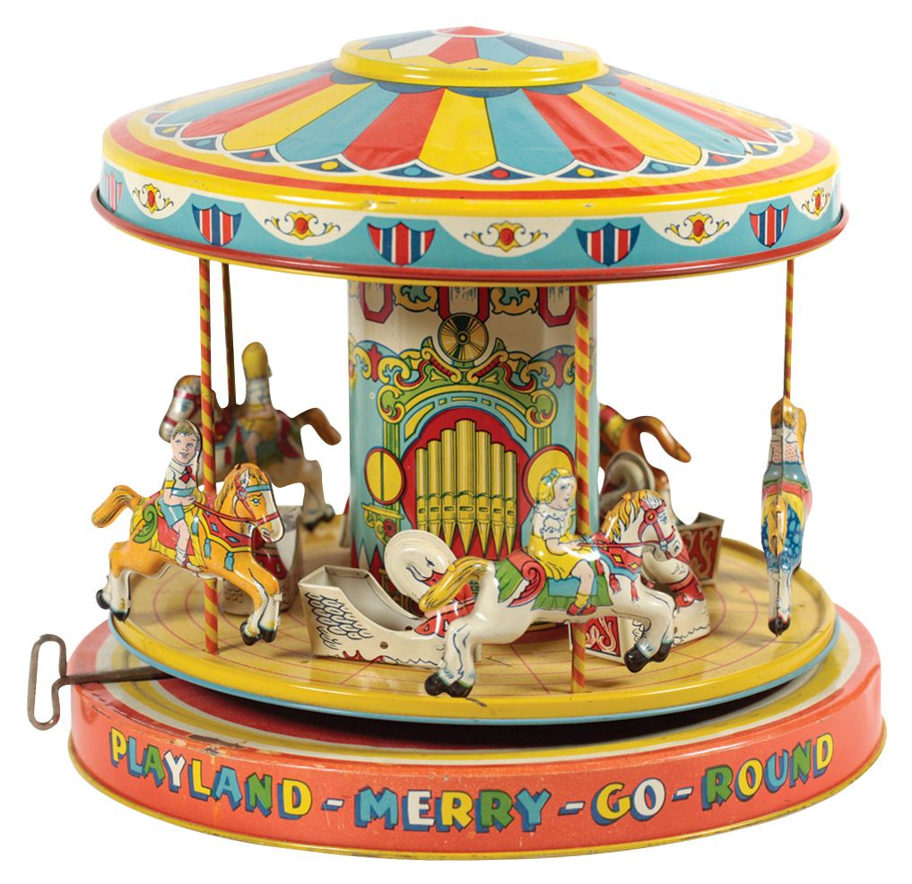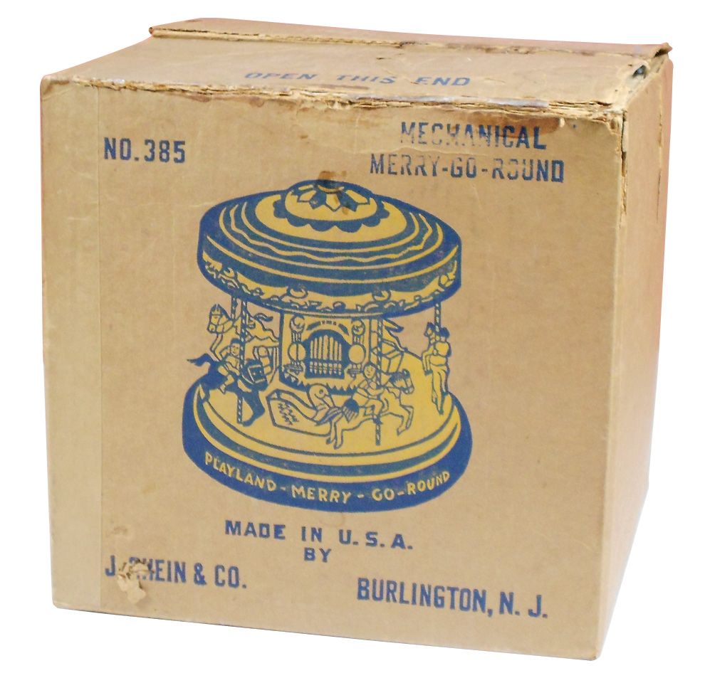Toy, J. Chein No. 385 Playland-Merry-Go-Round in orig box, colorful litho on tin wind-up w/great gra