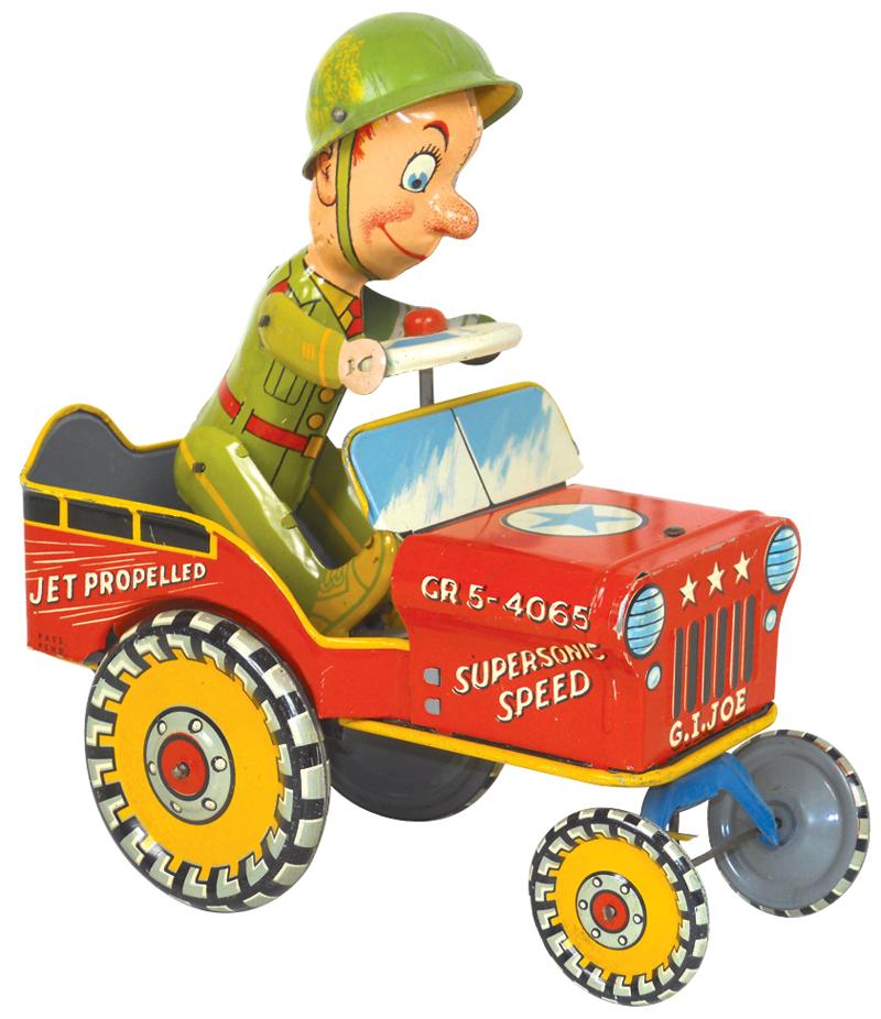Toy, J.I. Joe and his Jouncing Jeep, litho on tin windup by Unique Art Mfg. Co, Exc working cond, 8"H x 6.5"L.