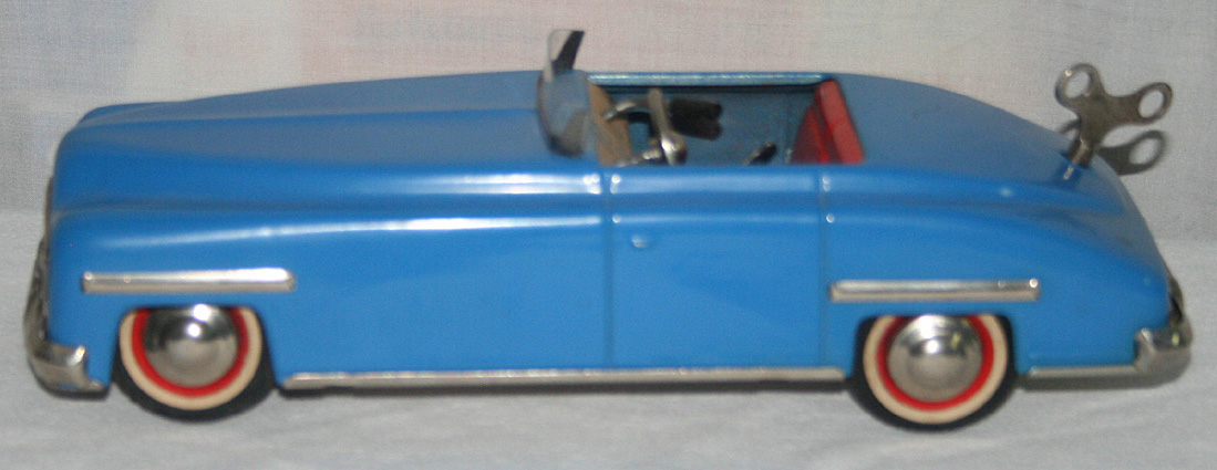 Metal Key Wind Convertible - Blue - 10" L. Blue paint is good with a few minor imperfections. Wind key and rear wheels spin. Three gears: forward, reverse, neutral. Working condition. Made in u.S. Zone Germany.