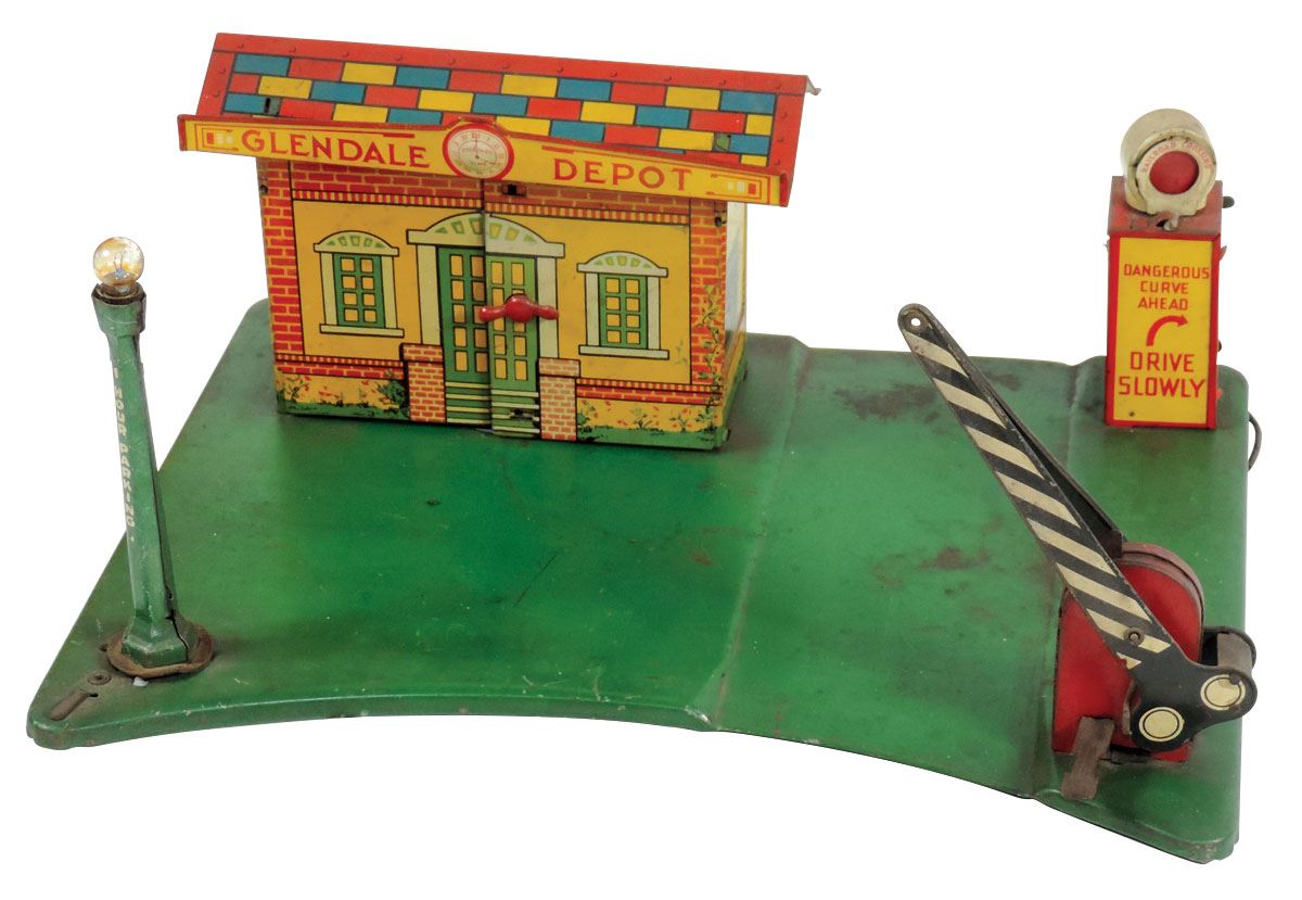 Toy, Marx Glendale Depot w/station, street light, crossing arm, etc., litho on tin, VG cond, 5.5"H x 13.5"W x 10.25"D.