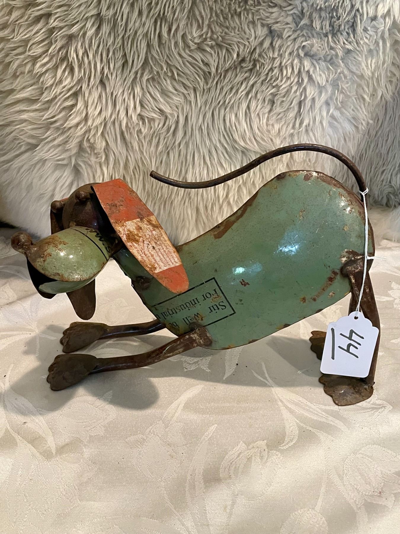 A toy metal dog offered in the auction is a charming vintage collectible, intricately designed with detailed features and a painted finish that captures the playful spirit of childhood nostalgia.