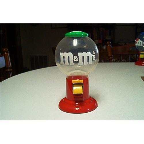 Collector's Item. This is an M & M Candy Dispenser. Blue Screw-on Lid. White M&M figures on the clear plastic container. The spout that lets the candy out is a bright yellow and blue. The base is a bright and colorful red plastic. Bottom base is embossed: CE-MARS INC.-MADE IN CHINA; "M AND THE "M&M' Letters are regestered trademarks of Mars, Incorporated: WARNING: CHOKING HAZARD-Small Parts Not For Children Under 3 years. This candy container would also be useful to use as a great bank. It measures 9 inches tall; 6 inches in diameter across front; side measures 3 1/2 inches; opening measures 2 1/2 inches; depth measures 6 1/4 inches; base diameter measures 4 3/4 inches. A great collector's item for candy or to use as a child's savings bank. ExcellentCondition.