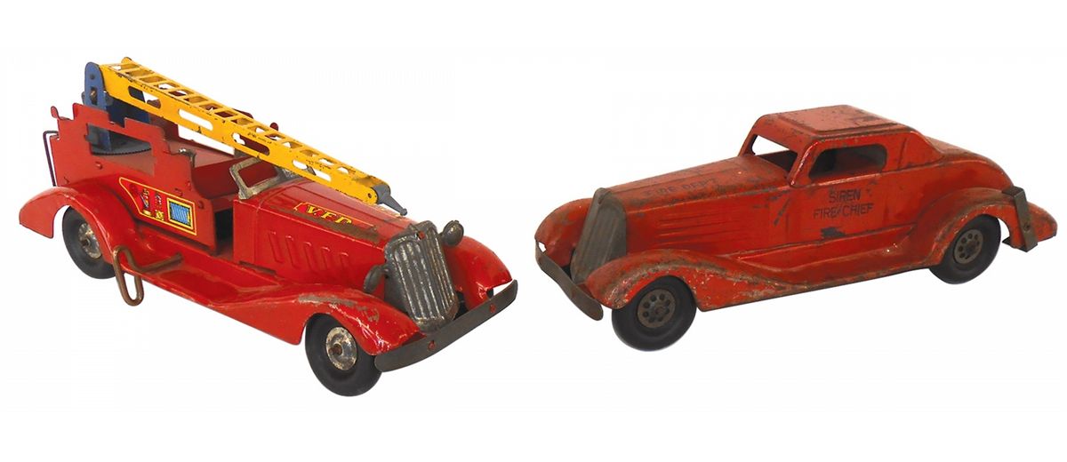 Toy Siren Fire Chief car (missing key) & V.F.D. Aerial Ladder Truck (no side ladders), Marx, pressed steel, Good/VG cond w/some paint wear, 14"L.