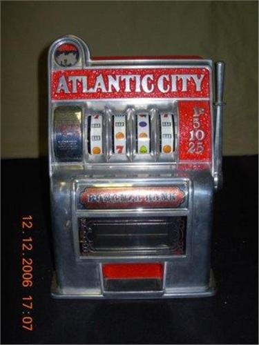 Metal slot machine. Approximately 11.25" tall, 8" wide, and 7" deep.