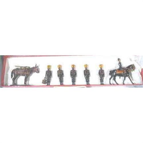 These pieces came together in a "Toy Exchange" box. One MUle with a gun on his back, 5 turbanned men one of whom is carrying a bucket. The others are standing to attention. The Officer who is mounted seems lighter in weight and size.