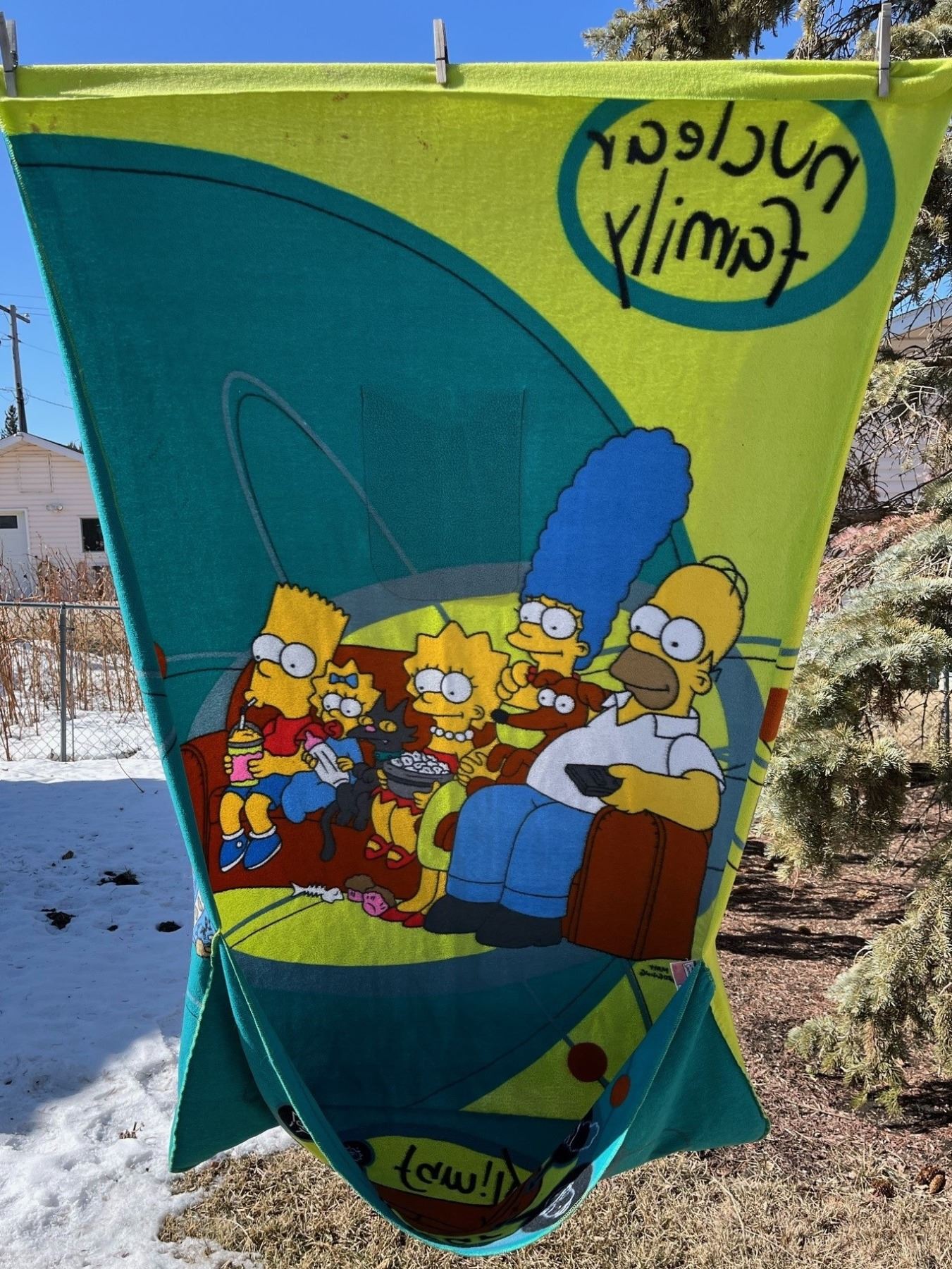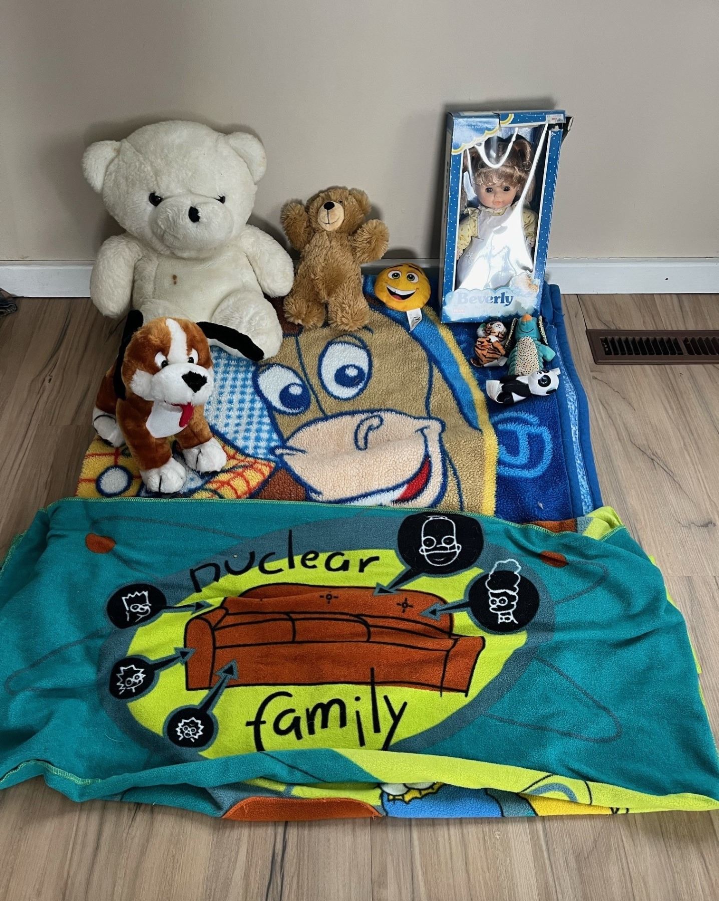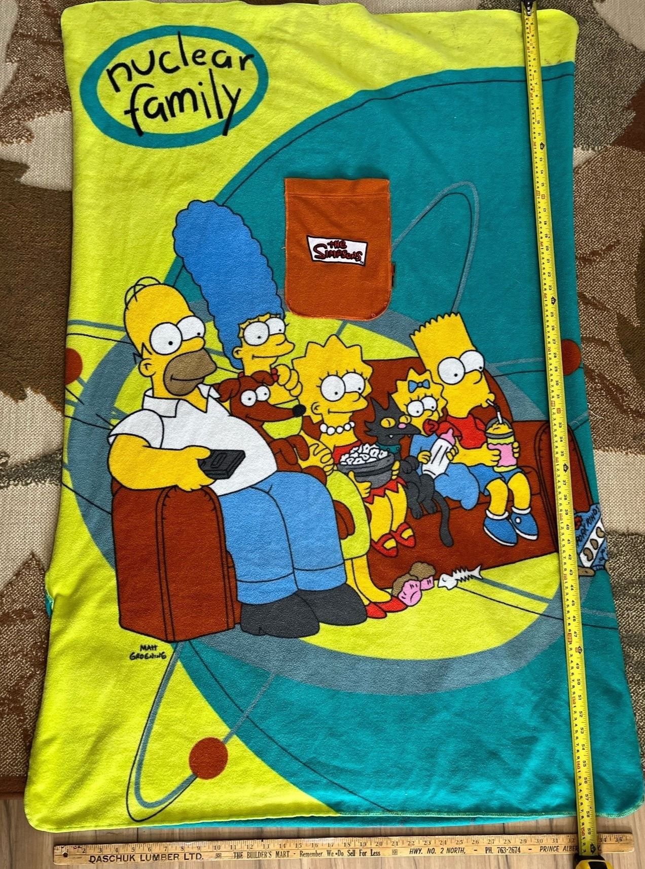 Toy Story (5' X 6 ½') Blanket & Simpsons (3' x 5') Snuggle Blanket with stuffies. Bear has a few stains.
