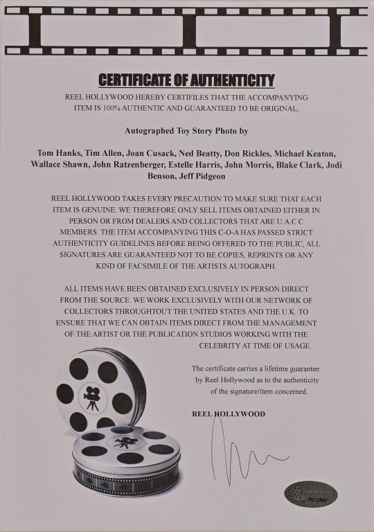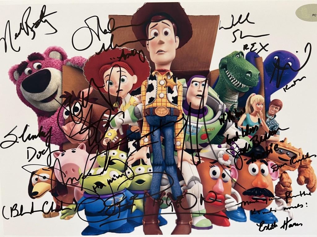Toy Story cast signed movie photo autographed by Ned Beatty, Jeff Pidgeon, Don Rickles, Estelle Harris, Wallace Shawn, Blake Clarke, John Ratzenberger, John Morris, Jodi Benson and Tim Allen. 8x10 inches. HL20124