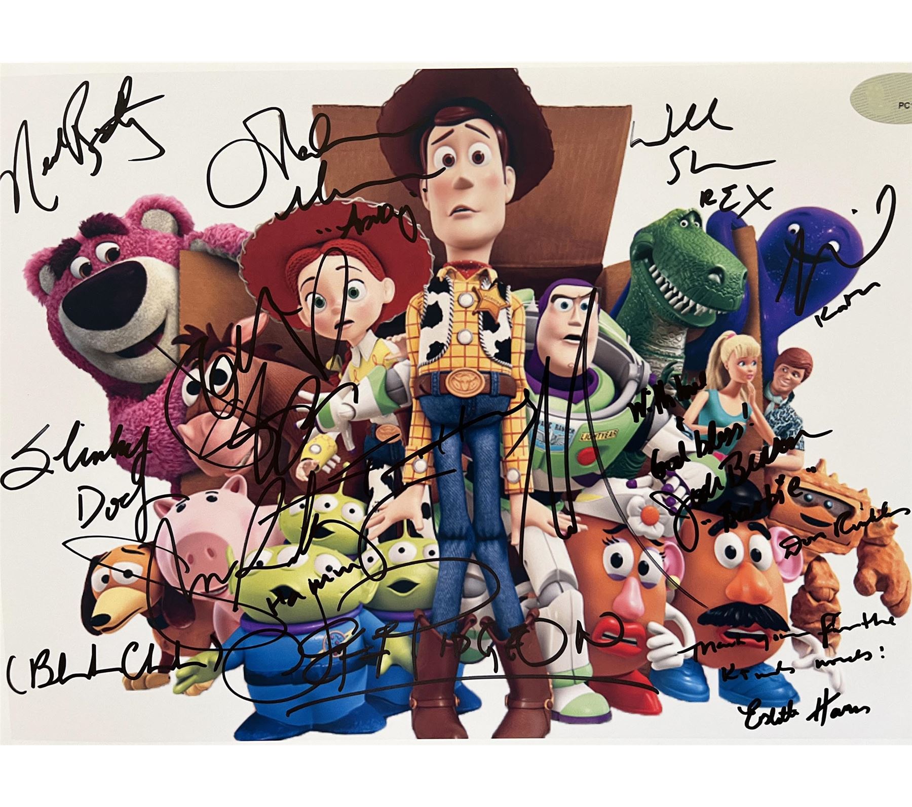 Toy Story cast signed movie photo autographed by Ned Beatty, Jeff Pidgeon, Don Rickles, Estelle Harris, Wallace Shawn, Blake Clarke, John Ratzenberger, John Morris, Jodi Benson and Tim Allen. 8x10 inches