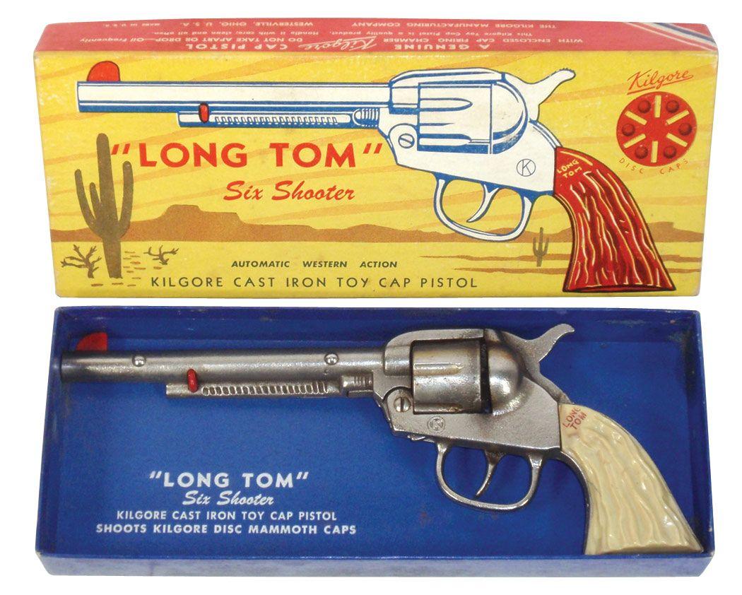 Toy cap gun in box, Kilgore cast iron "Long Tom" six shooter w/automatic action, both gun & box in Exc box, 4.5" x 10.5".