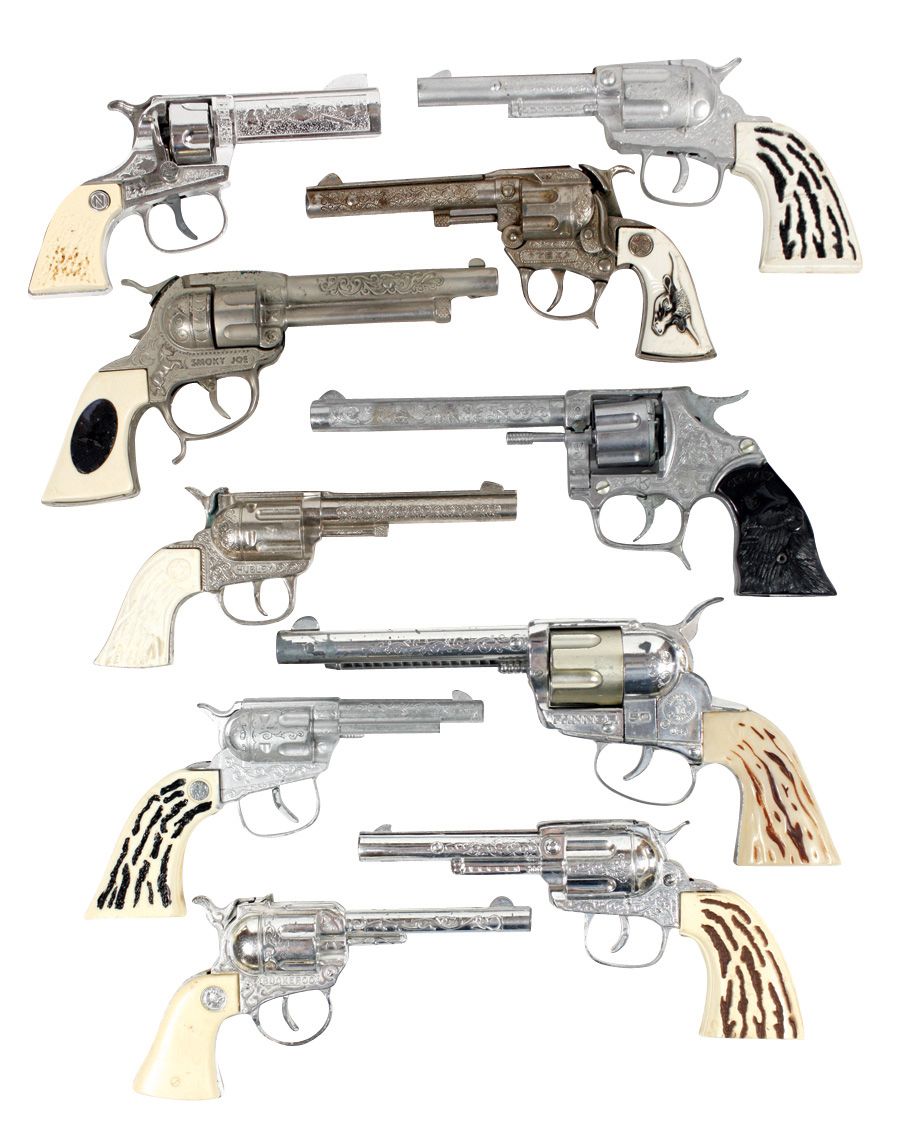 Toy cap guns (10), Kilgore w/Grizzly grips, Hubley Tex w/Steer grips & other guns by Stallion, Matte